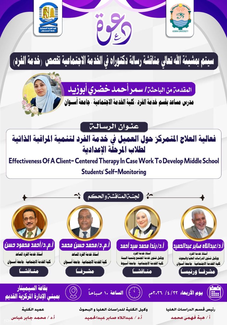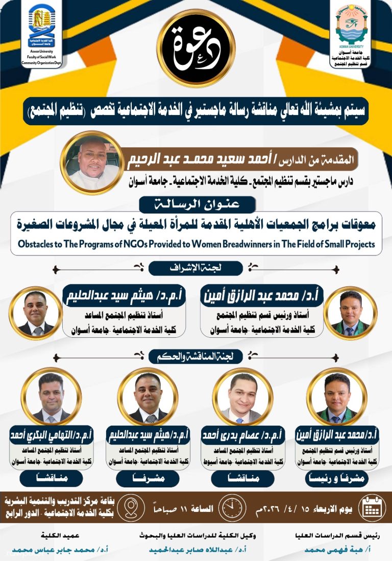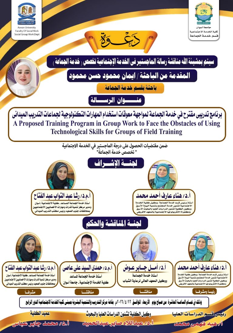 تحت رعاية السيد الأستاذ الدكتور/ محمد جابر عباس محمد- عميد كلية الخدمة الإجتماعية جامعة أسوان. تمت مناقشه رساله الماجستير المقدمة...