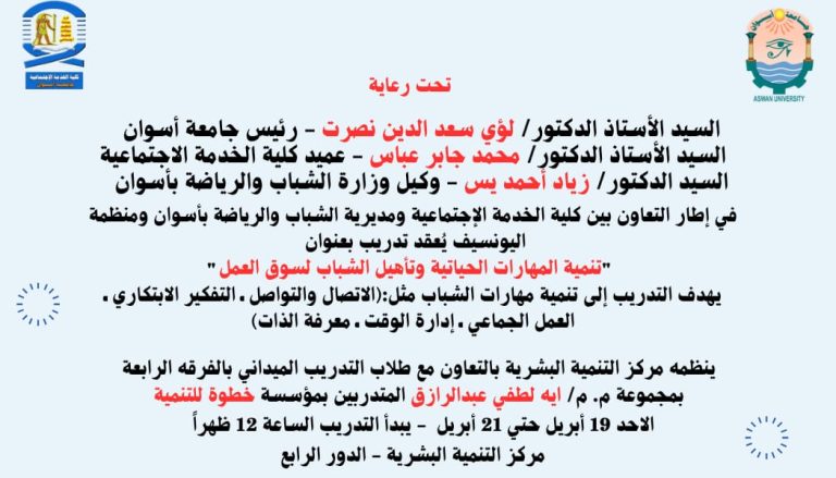 تدريب بعنوان “تنمية المهارات الحياتية وتأهيل الشباب لسوق العمل “