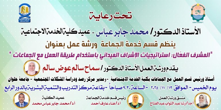 تحت رعاية الاستاذ الدكتور/محمد جابر عباس عميد الكلية ينظم قسم خدمة الجماعة ورشة عمل بعنوان" المشرف الفعال: استراتيجيات الإشراف الميداني...