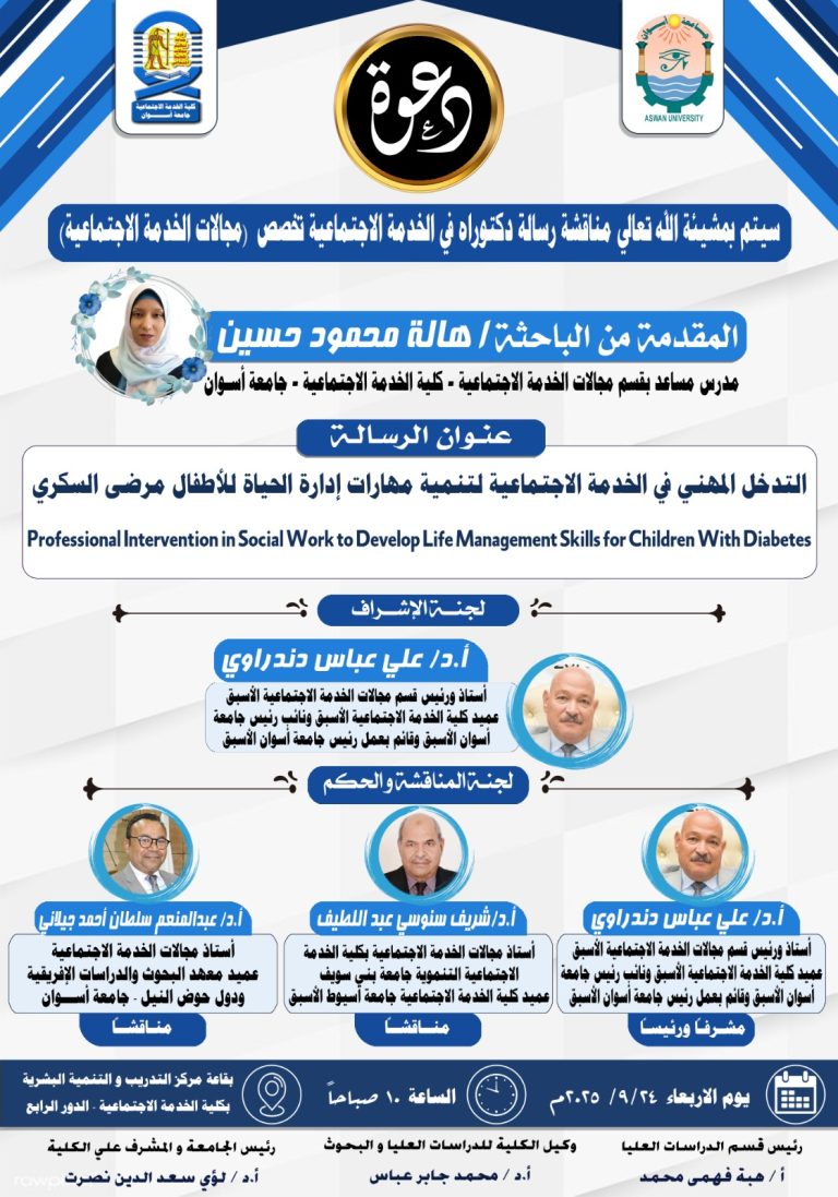 تقرر مناقشة الباحثة/ هاله محمود حسين  –  مدرس مساعد بقسم مجالات الخدمة الاجتماعية مرحلةالدكتوراه في يوم الاربعاء  الموافق ٢٠٢٥/٩/٢٤م في...