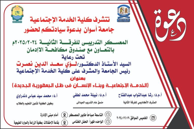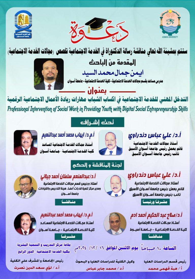 تقرر مناقشة الباحث/ ايمن جمال محمد السيد- بقسم مجالات الخدمة الاجتماعية مرحلة الدكتوراه في يوم الاثنين الموافق ٢٠٢٤/١٢/١٦م في تمام...