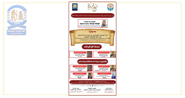 تقرر مناقشة الباحث/ مؤمنة موسان حسن- بقسم تنظيم المجتمع مرحلة الماجستير في يوم الأحد الموافق ٢٠٢٤/١٠/٢٧م في تمام...