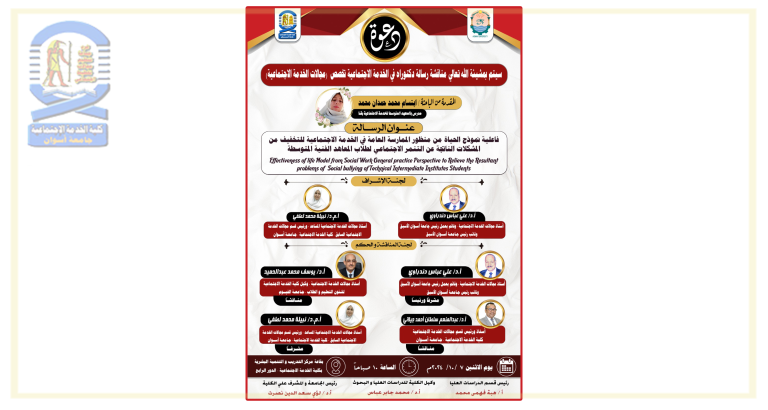 تقرر مناقشة الباحثة/ إيمان أحمد إسماعيل محمد- المدرس المساعد بقسم خدمة الجماعة مرحلة الدكتوراه في يوم الثلاثاء الموافق...