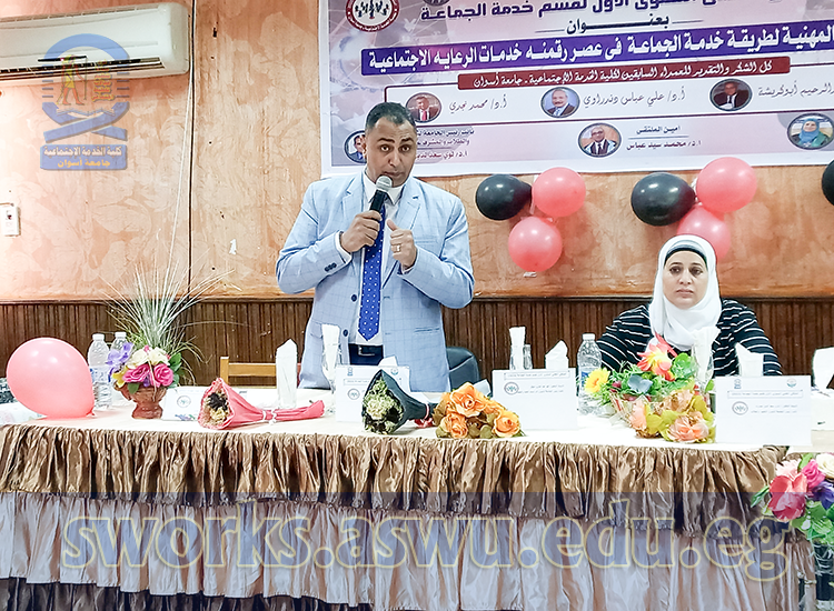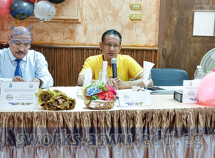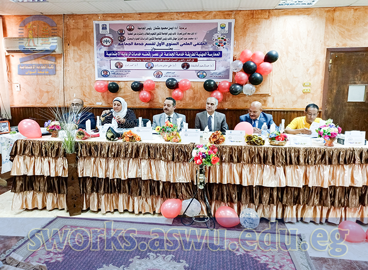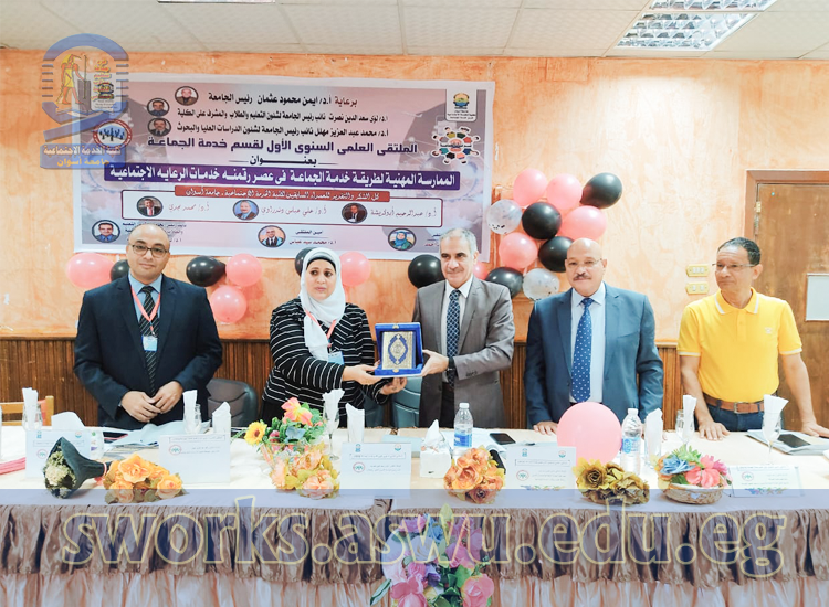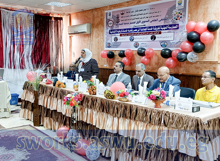 The conference was held in the attendance of Prof. Loay Saad Eddin Nusrat-Vice-University President of Education and Student Affairs and the Supervisor of the Faculty, Prof.Mohamed Abdel Aziz Mahal-Vice-University President of Postgraduate Studies and Research Affairs, Prof. Ali Abbas Dandrawi-Professor of Social Work Fields and Former Vice-University President of Group Work and Environmental Development Affairs, Prof.Emad Thrwat Sharqawy -Dean of Aswan Higher Institution of Social Work, Prof. Hanaa Aref Ahmed – Professor and Head of Group Work Department “Reporter of the Forum”, and Prof. Muhammad Sayed Abbas – Professor of Group Work Department and Vice Dean for Education and Student Affairs “Secretary of the Forum”, and Prof. Hamdi Al-Sayed Assi – Assistant Professor of Group Work Department , Dr. Ayman Ahmed Essam – A Lecturer of the Group Work Department, Dr. Adel Khalaf Hassan -A Lecturer of the Group Work Department, Dr. Aya Adly – An Assistant Lecturer of the Group Work Department, and Dr. Shazly Abu Al-Hajjaj Taye – An Assistant Lecturer in the Group Work Department, and Dr. Azza Al-Sayed – Assistant Lecturer, Department of Group Work Department, and Ms. Warda Al-Senussi – Demonstrator of Group Work Department Department.