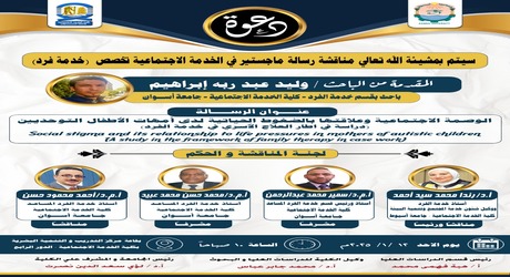 It was planned to discuss the researcher/Walid Abd Rabbo Ibrahim at the casework department (master thesis) on Sunday, December 1, 2025, at 10:00 a.m. in the Training Center and Human Development Hall on the fourth level of the faculty building. This is among the requirements for acquiring a master’s degree in social work.