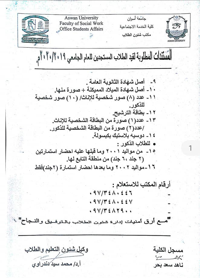 المستندات المطلوبة لتقديم للطلاب الجدد للعام الجامعى2019-2020