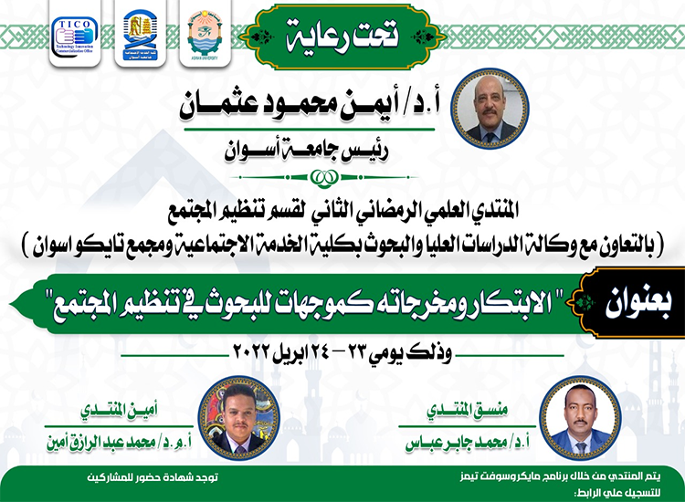 تحت رعاية “الأستاذ الدكتور/ أيمن محمود عثمان- رئيس جامعة أسوان” تمت فاعليات المنتدى العلمي الرمضاني الثاني لقسم تنظيم المجتمع بالتعاون مع وكالة الدراسات العليا والبحوث بكلية الخدمة الاجتماعية ومجمع تايكو أسوان، وذلك في يومي السبت والأحد الموافقين ٢٣،و٢٤من أبريل الجاري.