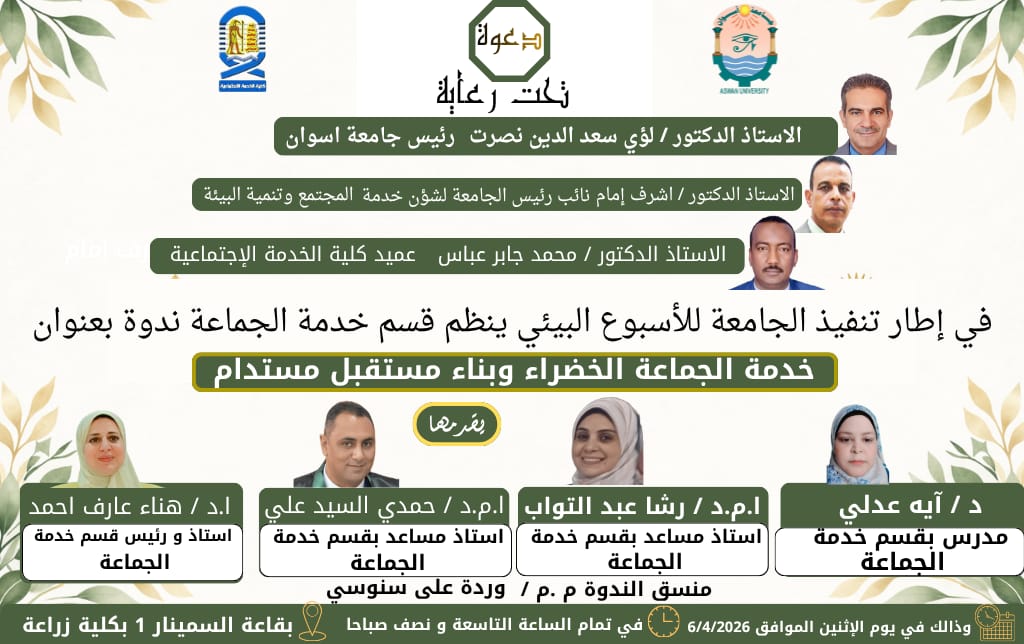 في إطار تنفيذ الجامعة للأسبوع البيئي ينظم قسم خدمة الجماعة ندوة بعنوان: خدمة الجماعة الخضراء وبناء مستقبل مستدام.