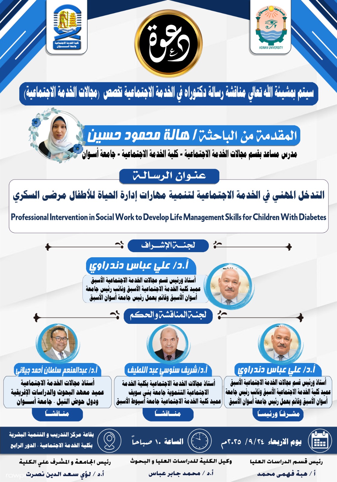 تقرر مناقشة الباحثة/ هاله محمود حسين – مدرس مساعد بقسم مجالات الخدمة الاجتماعية مرحلةالدكتوراه في يوم الاربعاء الموافق ٢٠٢٥/٩/٢٤م في تمام العاشرة صباحاً بقاعة مركز التدريب والتنمية البشرية بمبنى الكلية الدور الرابع، وذلك ضمن متقتضيات الحصول على درجة الدكتوراه في الخدمة الاجتماعية.
