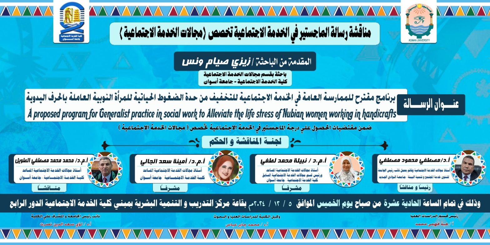 اعلان مناقشة ماجستير بقسم مجالات الخدمة الاجتماعية