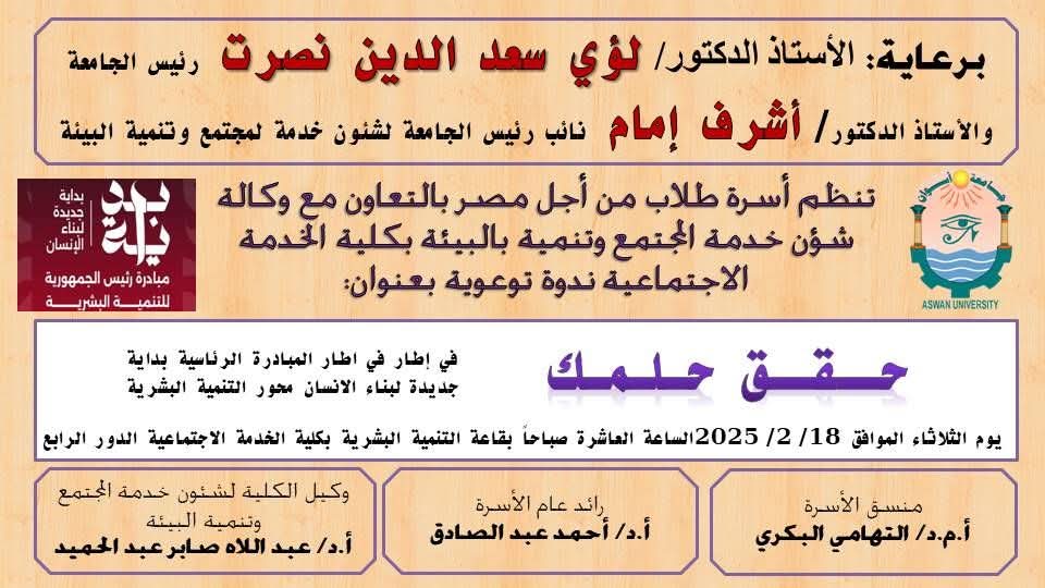 وبحضور سعادة الاستاذ الدكتور / أشرف امام نائب رئيس الجامعة لشون خدمة المجتمع وتنمية البيئة تنظمت وكالة شؤن خدمة المجتمع وتنمية بالبيئة بكلية الخدمة الاجتماعية ندوة توعوية أسرة بالتعاون مع طلاب من أجل مصر بالتعاون مع بعنوان: (حقق حلمك) في اطار في تنفيذ المبادرة الرئاسية «بداية جديدة لبناء الإنسان» محور التنمية البشرية تعتزم وكالة شؤن خدمة المجتمع وتنمية بالبيئة بالتعاون أسرة طلاب من أجل مصر بتنفيذ ندوة توعوية بعنوان((حقق حلمك)) وذلك يوم الثلاثاء الموافق 18/ 2/2025م بقاعة التنمية البشرية بكلية الخدمة الاجتماعية وشارك في تنفيذ الندوة كلاً:
