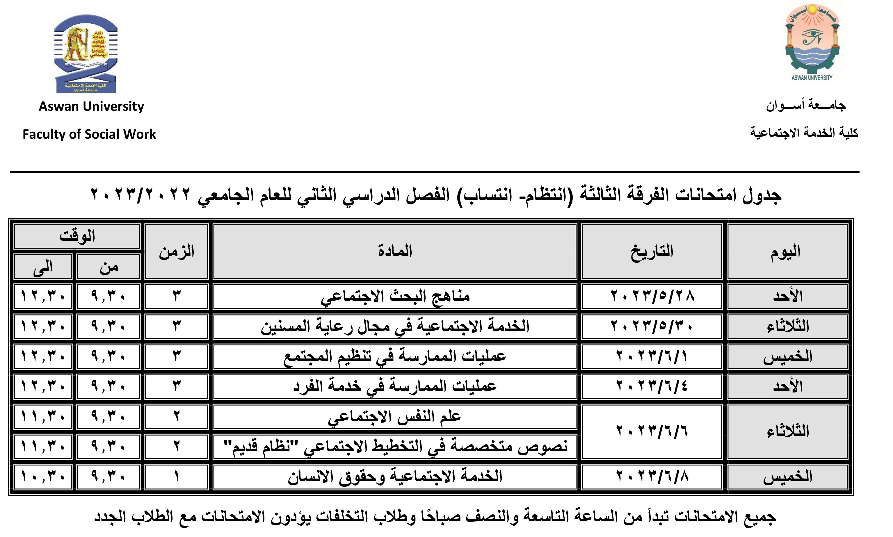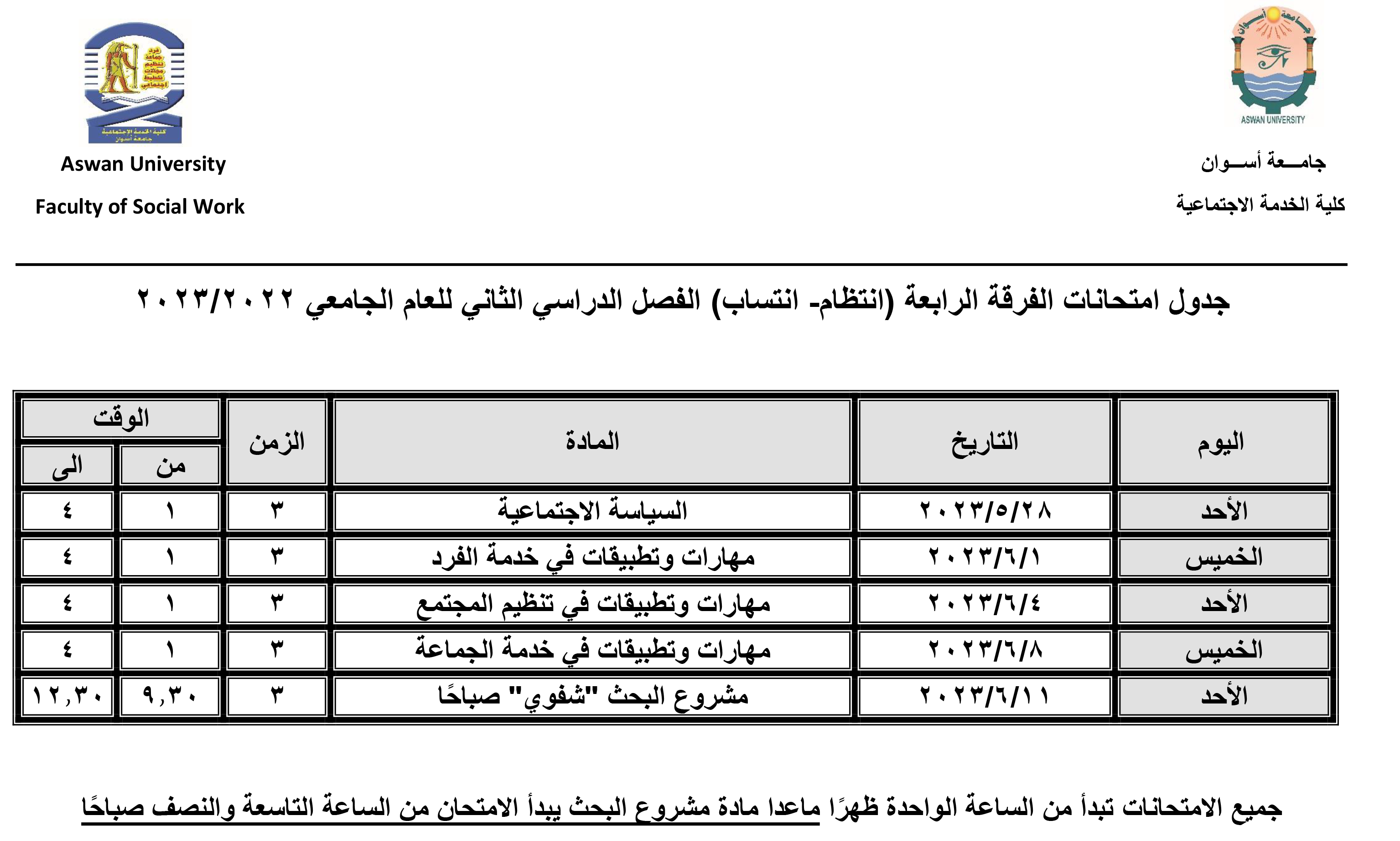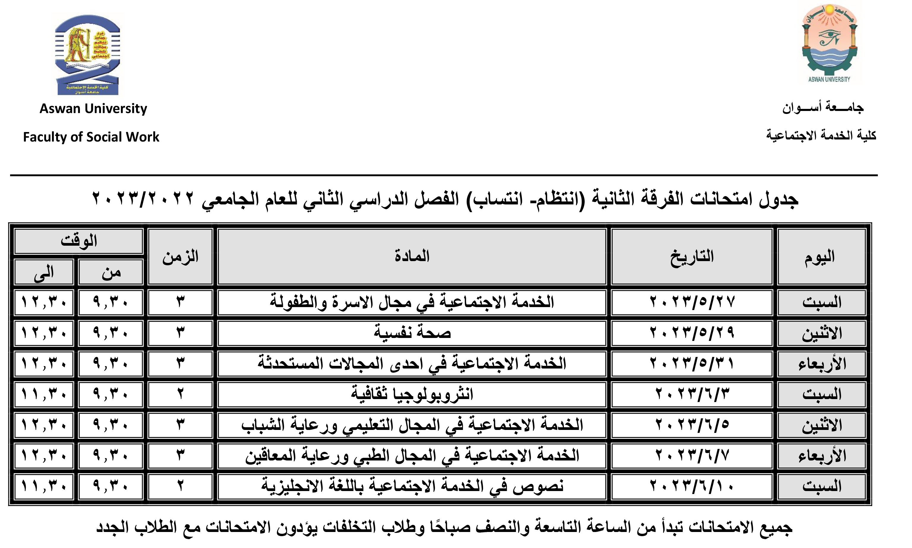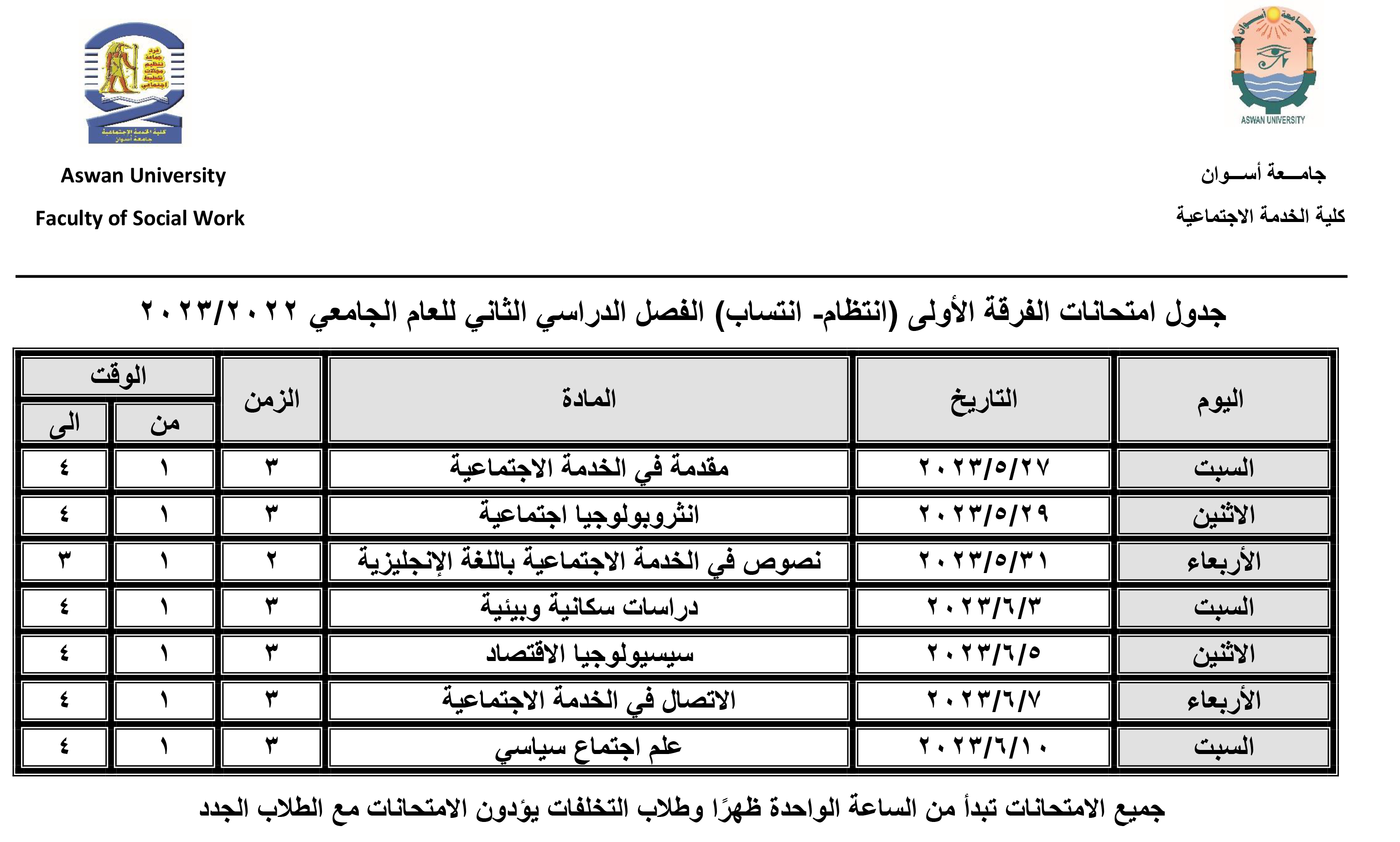 برعاية كريمة من الأستاذ الدكتور/ لؤي سعد الدين نصرت- نائب رئيس الجامعة لشئون التعليم والطلاب والمشرف على الكلية، والأستاذ الدكتور/ محمد سيد عباس- وكيل الكلية لشئون التعليم والطلاب، تم اعتماد جدول امتحانات الفرق الدراسية الأربعة للفصل الدراسي الثاني للعام الجامعي ٢٠٢٣/٢٠٢٢ وذلك على النحو التالي: