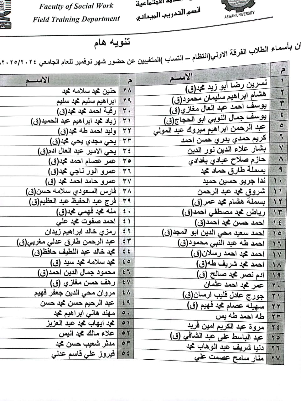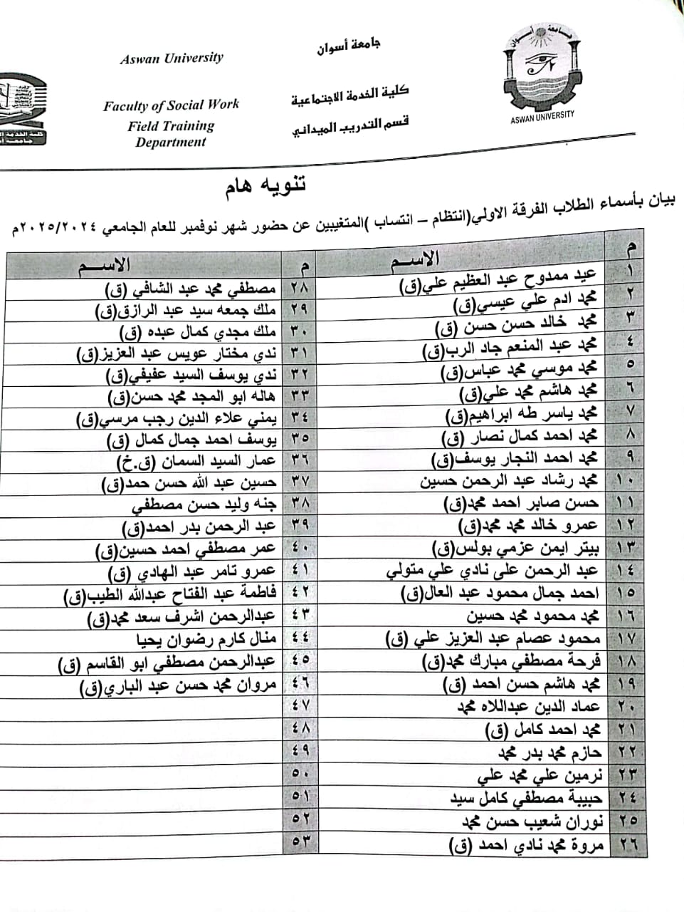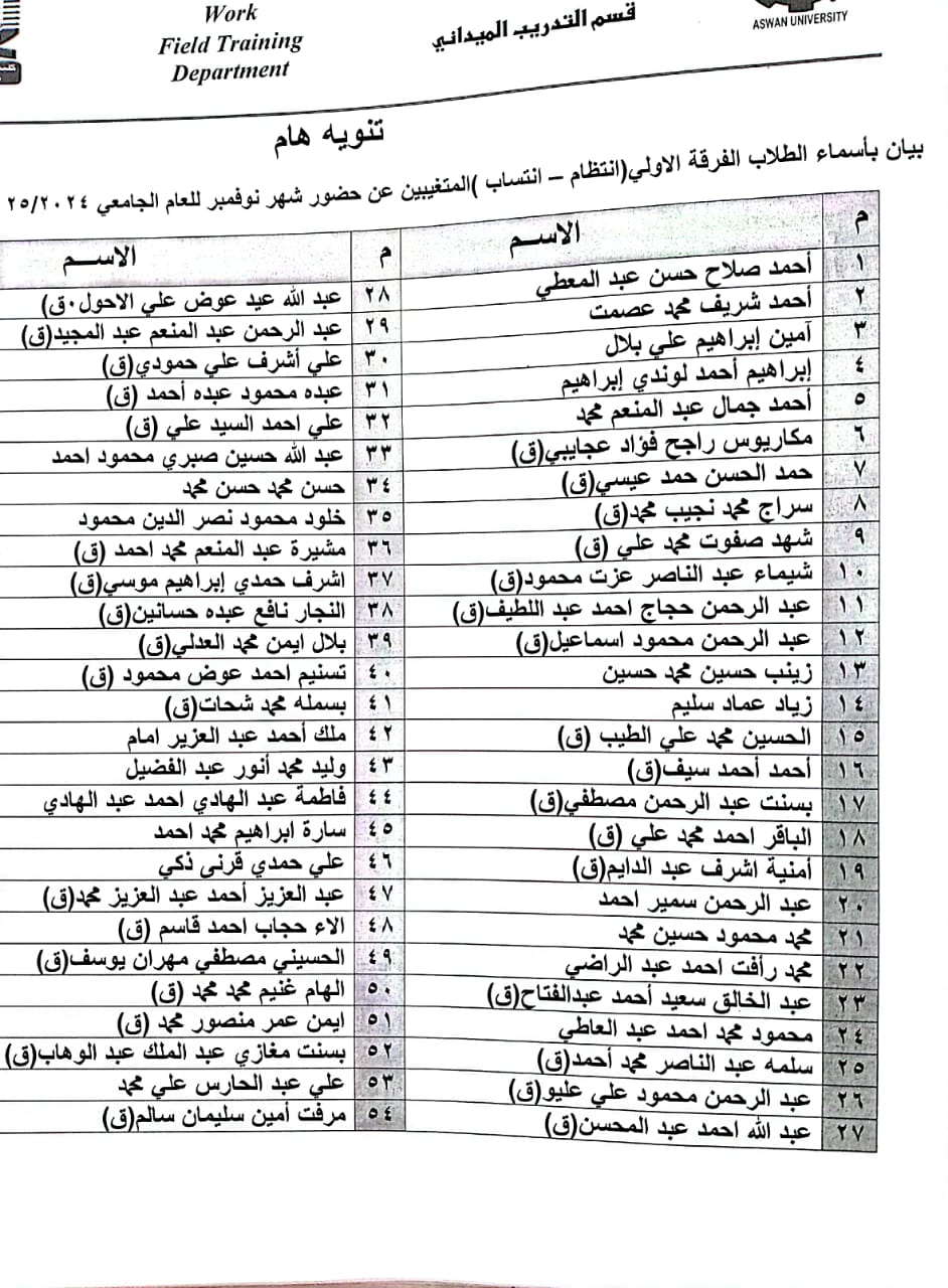 اسماء طلاب الفرقة الاولي المتغيبين عن حضور التدريب لشهر نوفمبر