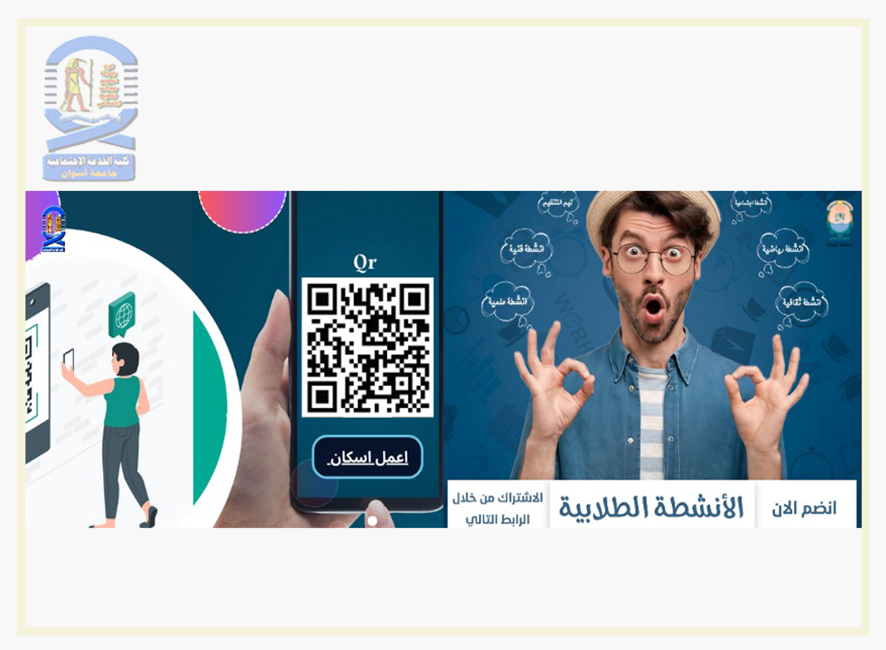 يدعوكم قسم رعاية الشباب بالكلية للإشتراك في الأنشطة الطلابية المختلفة، وعلى الطلاب الراغبين بالإشتراك الدخول على كود الــ QR الموضح بالصورة المرفقة للدخول إلى الاستمارة للتسجيل في الأنشطة.
