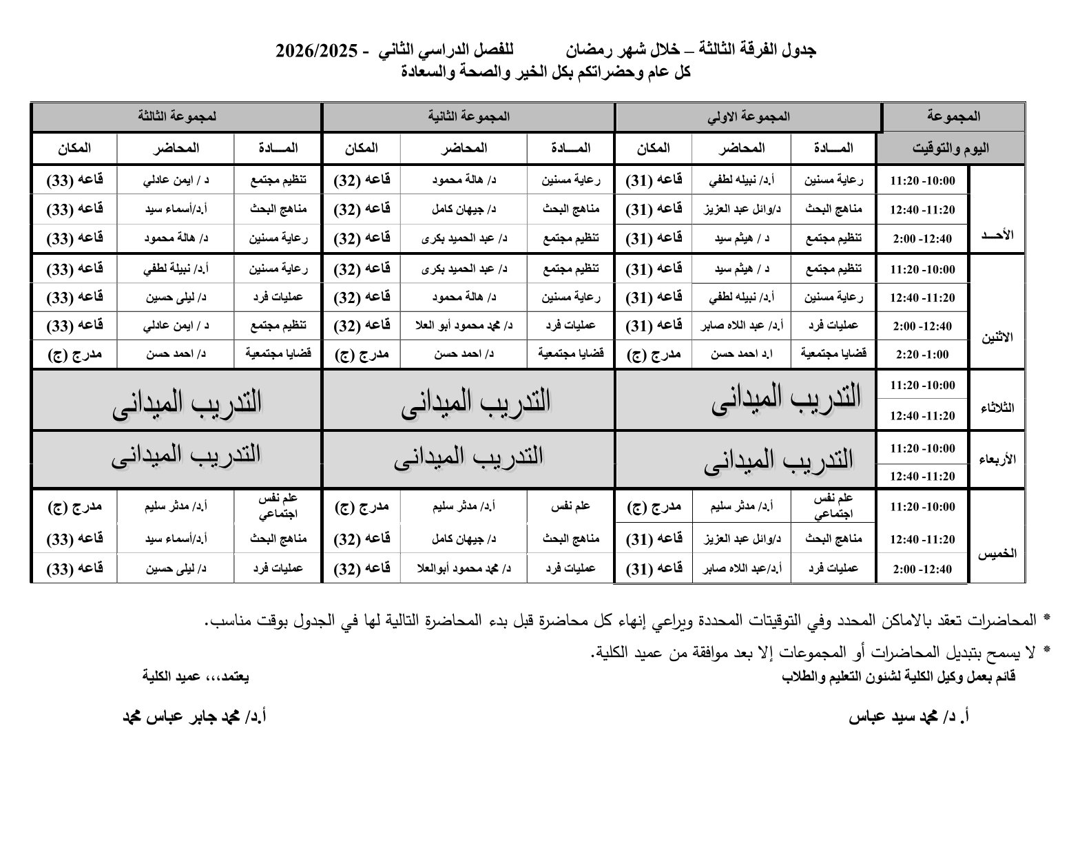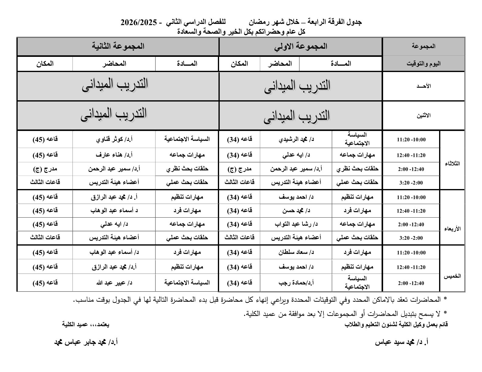 جدول المحاضرات للفرق الاربع ( انتظام – انتساب) بالكلية خلال شهر رمضان