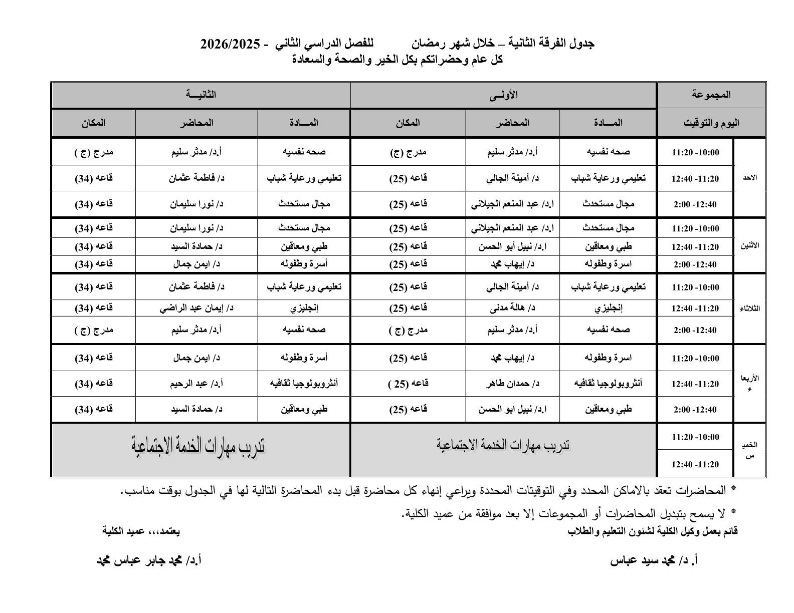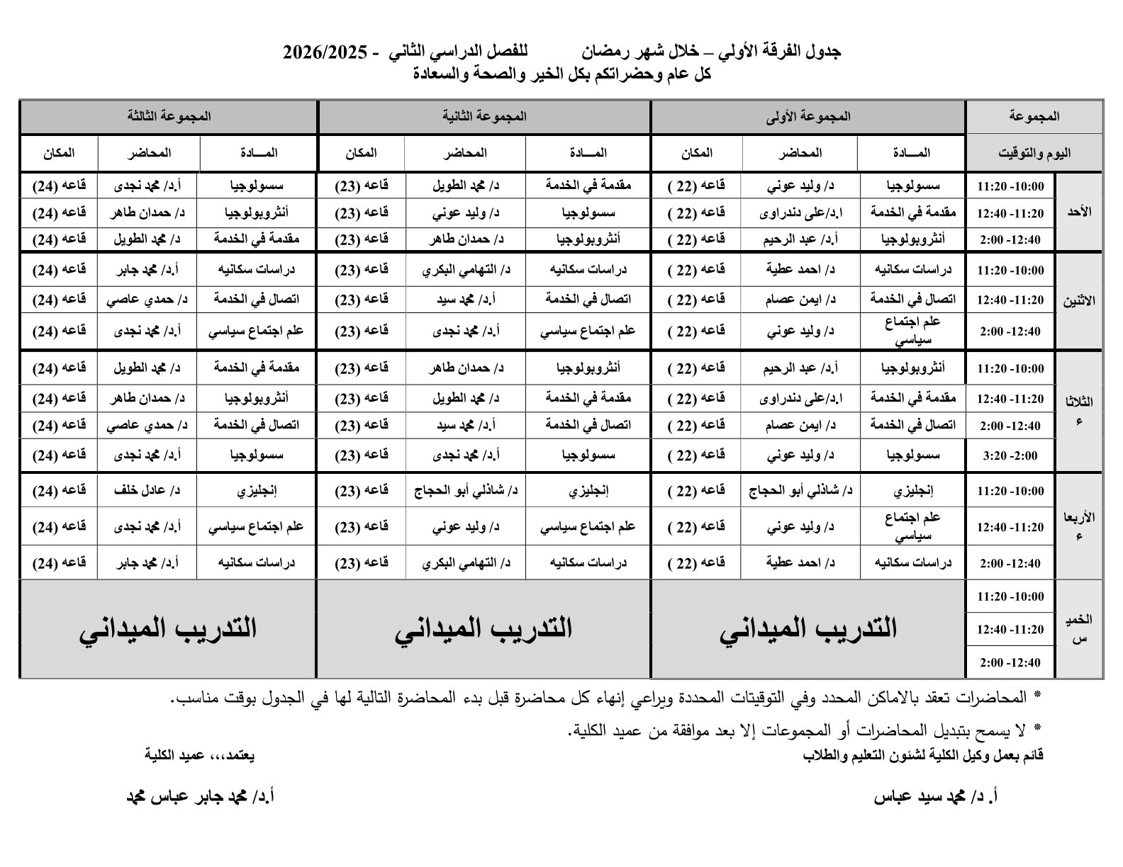يسعد إدارة الكلية أن تعلن لكم جدول المحاضرات للفرق الاربع ( انتظام – انتساب) بالكلية خلال شهر رمضان.