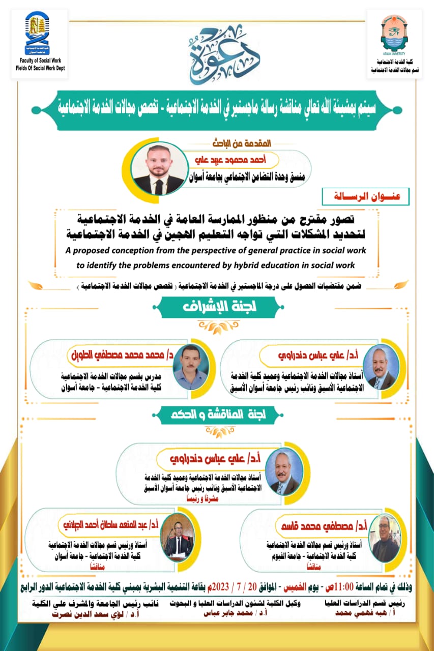 تقرر مناقشة الباحث / أحمد محمود عبيد علي – بقسم مجالات الخدمة الاجتماعية مرحلة الماجستير في يوم الخميس الموافق ٢٠٢٣/٧/٢٠م في تمام الحادية عشر صباحاً بقاعة مركز التدريب والتنمية البشرية بمبنى الكلية الدور الرابع، وذلك ضمن متقتضيات الحصول على درجة الماجستير في الخدمة الاجتماعية.