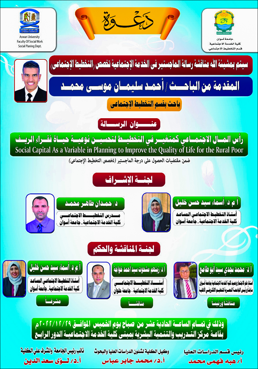 تقرر مناقشة “الدارس/ أحمد سُلَيمان موسى محمد – بقسم التخطيط الاجتماعي”، وذلك في يوم الخميس الموافق ٢٠٢٢/١٢/٢٩ م في تمام الحادية عشر صباحاً بقاعة التنمية البشرية بمبنى كلية الخدمة الاجتماعية – الدور الرابع.