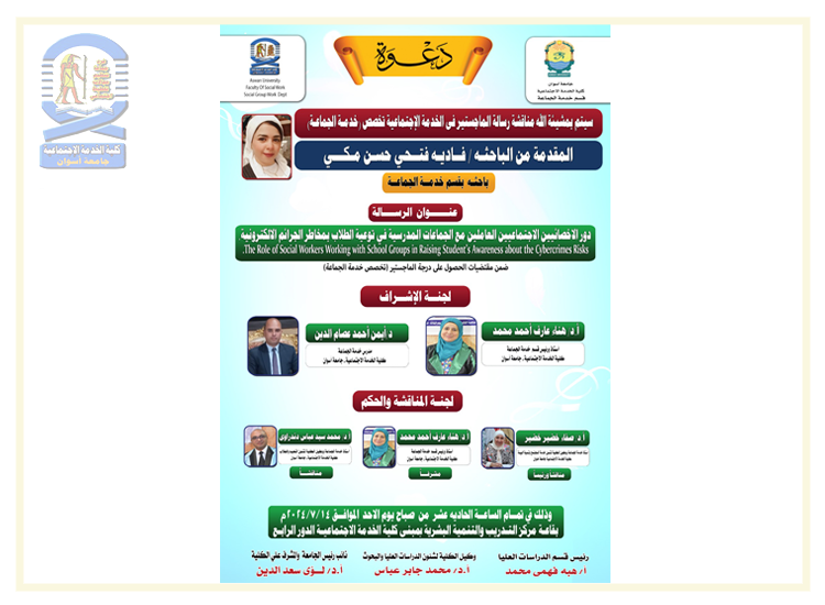 اعلان مناقشة ماجستير بقسم خدمة الجماعة
