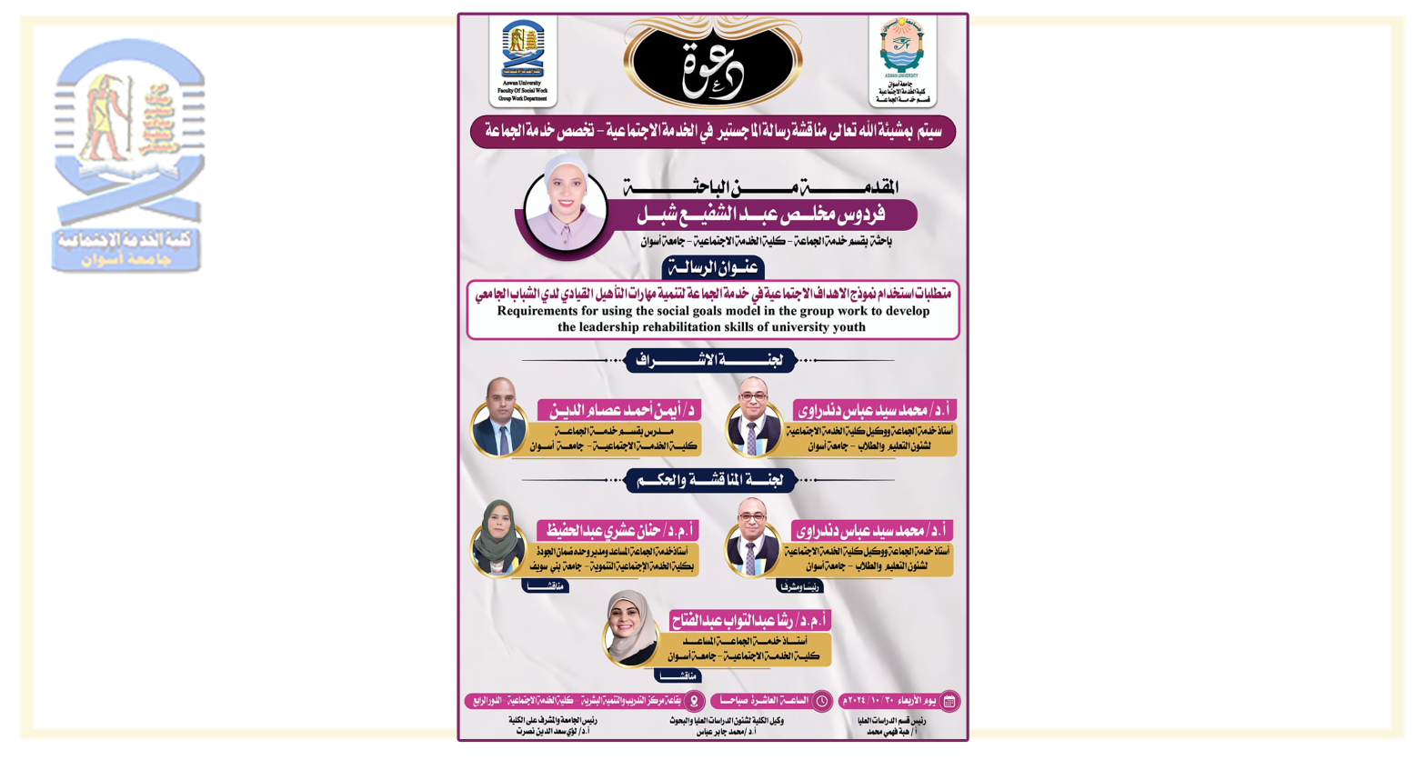 تقرر مناقشة الباحثة/ فردوس مخلص عبدالشفيع شبل- بقسم خدمة الجماعة مرحلة الماجستير في يوم الأربعاء الموافق ٢٠٢٤/١٠/٣٠م في تمام العاشرة صباحاً بقاعة مركز التدريب والتنمية البشرية بمبنى الكلية الدور الرابع، وذلك ضمن متقتضيات الحصول على درجة الماجستير في الخدمة الاجتماعية.