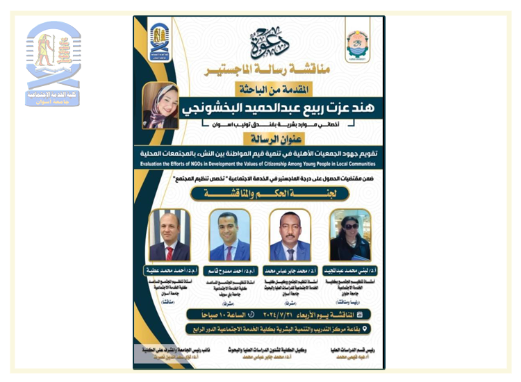 تقرر مناقشة الباحثة/ هند عزت ربيع عبدالحميد البخشونجي- بقسم تنظيم المجتمع مرحلة الماجستير في يوم الأربعاء الموافق ٢٠٢٤/٧/٣١م في تمام العاشرة صباحاً بقاعة مركز التدريب والتنمية البشرية بمبنى الكلية الدور الرابع، وذلك ضمن متقتضيات الحصول على درجة الماجستير في الخدمة الاجتماعية.