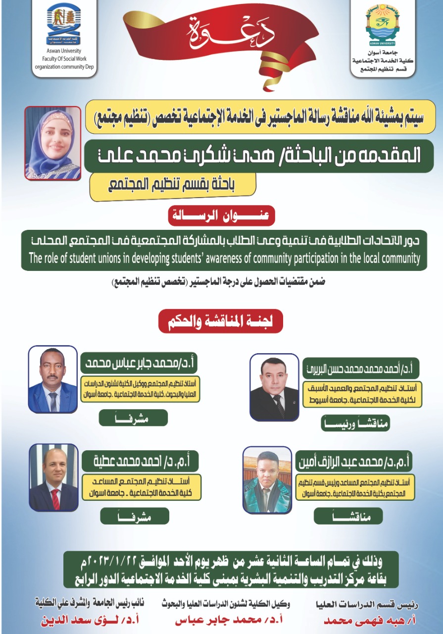 - أ.د/ محمد جابر عباس – أستاذ تنظيم المجتمع ووكيل الكلية لشئون الدراسات العليا والبحوث – كلية الخدمة الاجتماعية جامعة أسوان (مشرفاً)