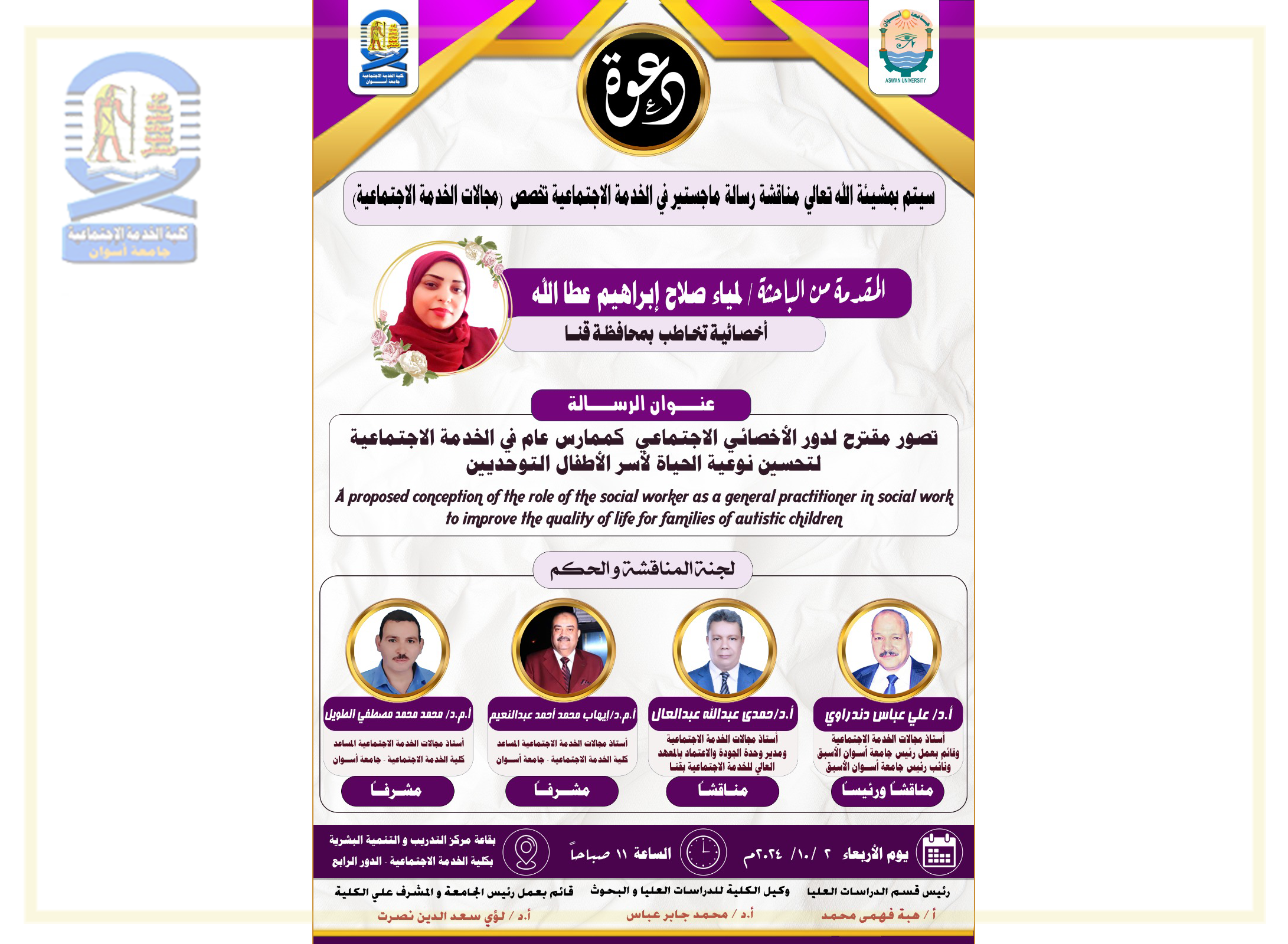 اعلان مناقشة ماجستير بقسم مجالات الخدمة الاجتماعية