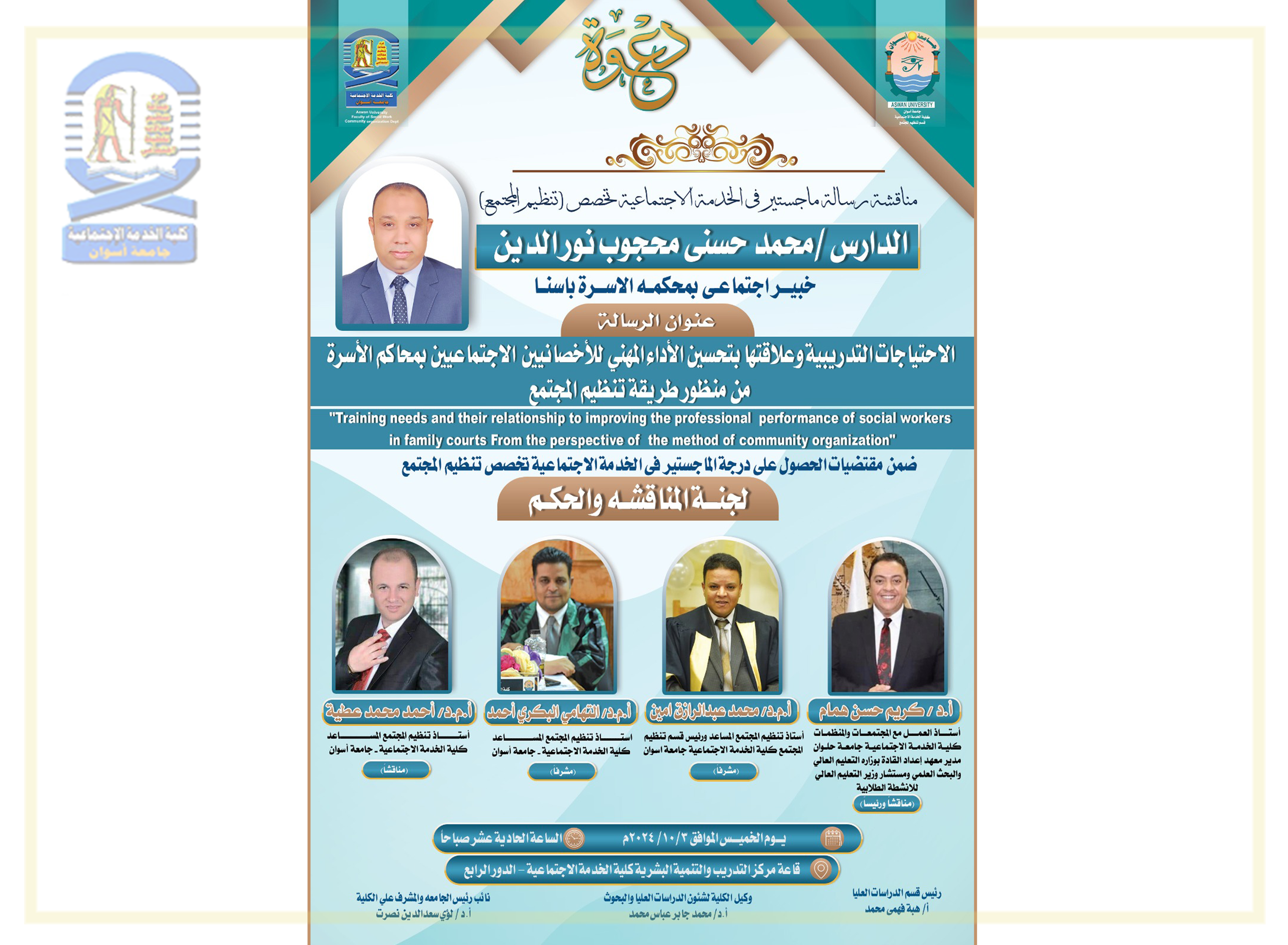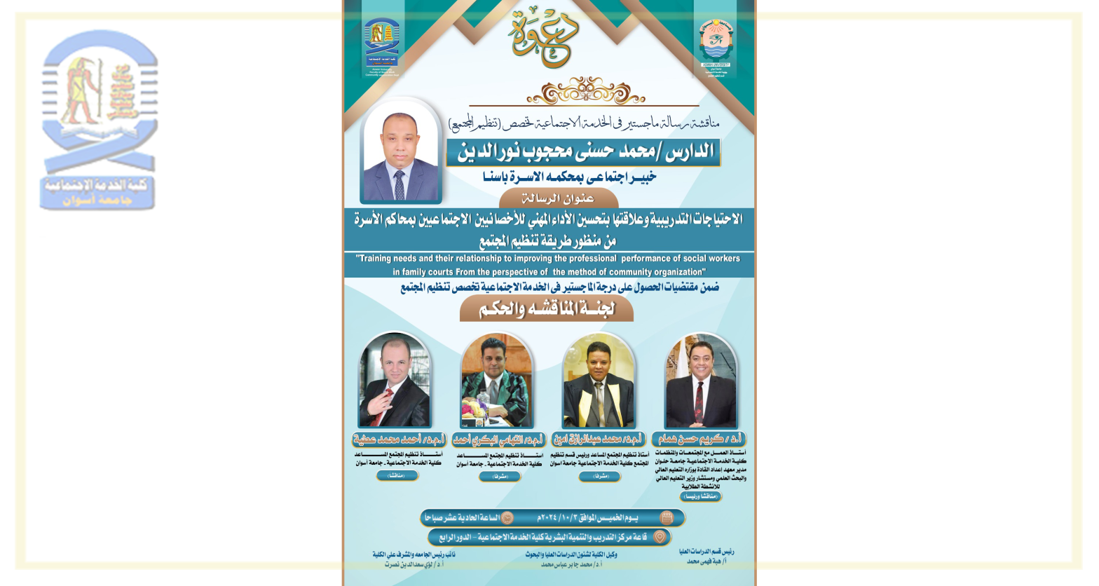تقرر مناقشة الباحث/ محمد حسني محجوب نور الدين- بقسم تنظيم المجتمع مرحلة الماجستير في يوم الخميس الموافق ٢٠٢٤/١٠/٣م في تمام الحادية عشر صباحاً بقاعة مركز التدريب والتنمية البشرية بمبنى الكلية الدور الرابع، وذلك ضمن متقتضيات الحصول على درجة الماجستير في الخدمة الاجتماعية.