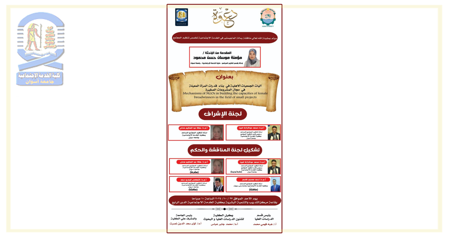 تقرر مناقشة الباحث/ مؤمنة موسان حسن- بقسم تنظيم المجتمع مرحلة الماجستير في يوم الأحد الموافق ٢٠٢٤/١٠/٢٧م في تمام العاشرة صباحاً بقاعة مركز التدريب والتنمية البشرية بمبنى الكلية الدور الرابع، وذلك ضمن متقتضيات الحصول على درجة الماجستير في الخدمة الاجتماعية.