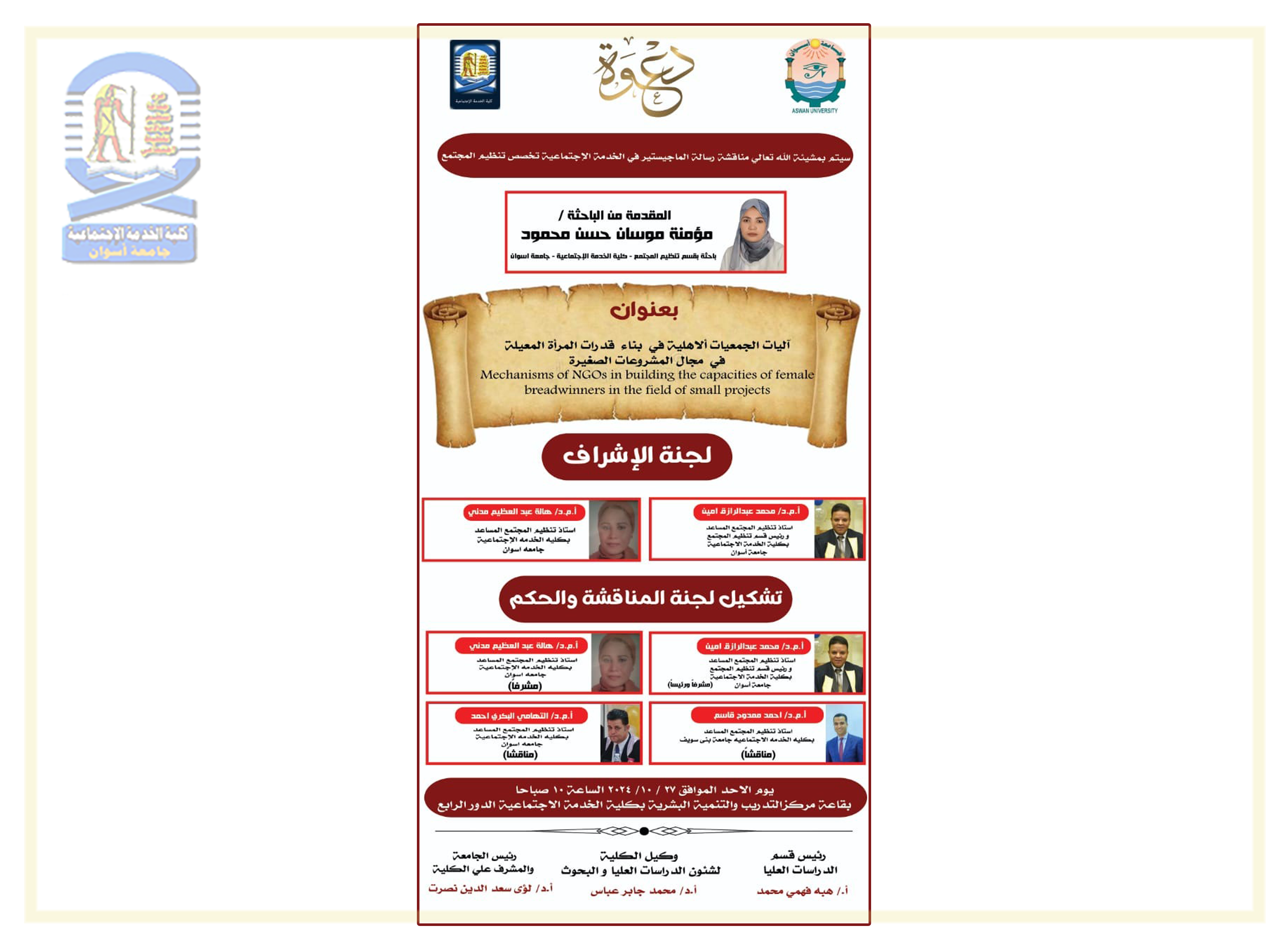 اعلان مناقشة ماجستير بقسم تنظيم المجتمع