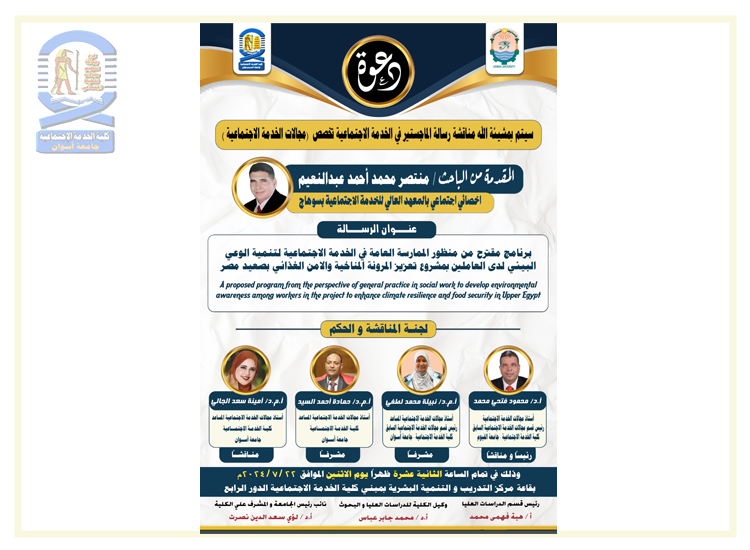 تقرر مناقشة رسالة الماجستير للباحث/ منتصر محمد أحمد عبدالنعيم- بقسم مجالات الخدمة الاجتماعية في يوم الأثنين الموافق ٢٠٢٤/٧/٢٢م في تمام الثانية عشر ظهراً بقاعة مركز التدريب والتنمية البشرية بمبنى الكلية الدور الرابع، وذلك ضمن متقتضيات الحصول على درجة الماجستير في الخدمة الاجتماعية.