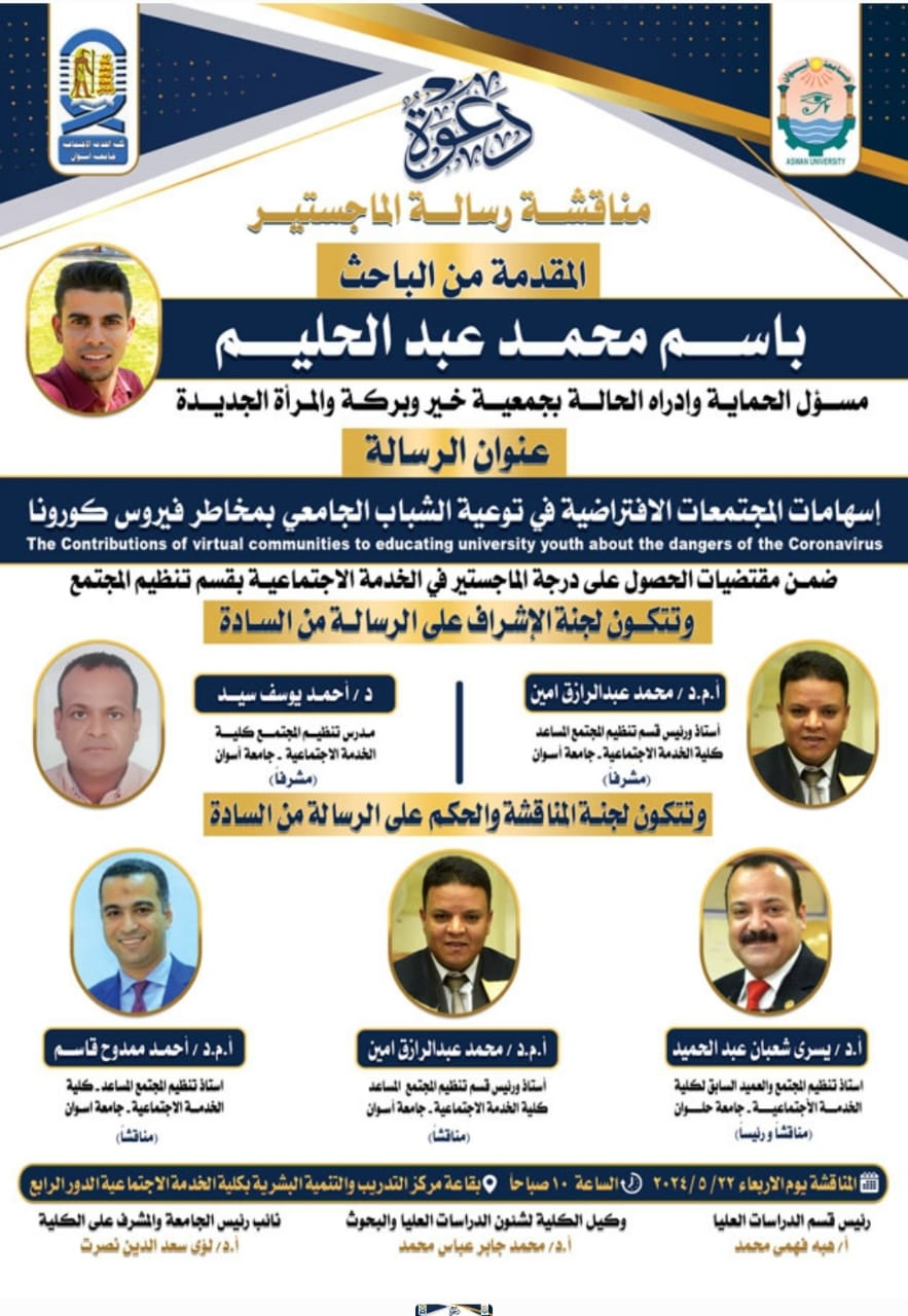 تقرر مناقشة الباحث / باسم محمد عبدالحليم- بقسم تنظيم المجتمع مرحلة الماجستير في يوم الأربعاء الموافق ٢٠٢٤/٥/٢٢م في تمام العاشرة صباحاً بقاعة مركز التدريب والتنمية البشرية بمبنى الكلية الدور الرابع، وذلك ضمن متقتضيات الحصول على درجة الماجستير في الخدمة الاجتماعية.