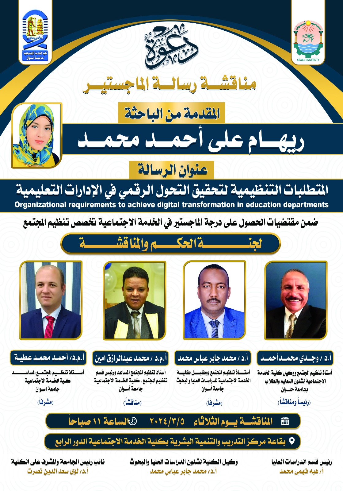 تقرر مناقشة الباحثة / ريهام علي أحمد محمد- بقسم تنظيم المجتمع مرحلة الماجستير في يوم الثلاثاء الموافق ٢٠٢٤/٣/٥م في تمام الحادية عشر صباحاً بقاعة مركز التدريب والتنمية البشرية بمبنى الكلية الدور الرابع، وذلك ضمن متقتضيات الحصول على درجة الماجستير في الخدمة الاجتماعية.