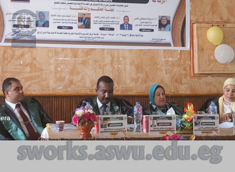- أ.م.د/ هالة عبدالعظيم مدني – أستاذ تنظيم المجتمع المساعد بكلية الخدمة الاجتماعية – جامعة أسوان (مناقشاً).