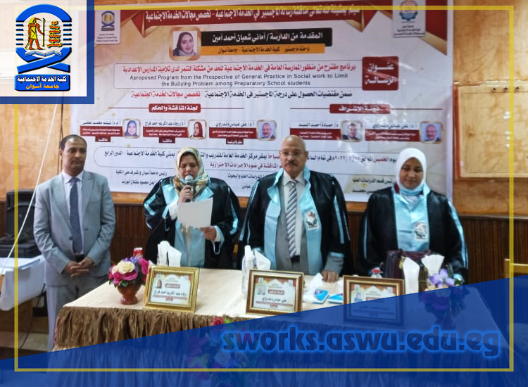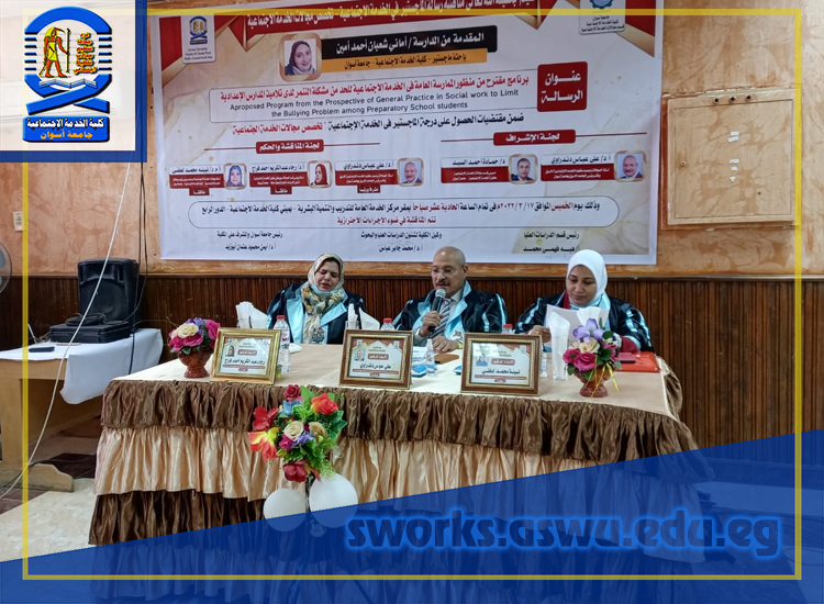والرسالة بعنوان “ برنامج مقترح من منظور الممارسة العامة في الخدمة الاجتماعية للحد من مشكلة التنمر لدى تلاميذ المدارس الاعدادية ” .