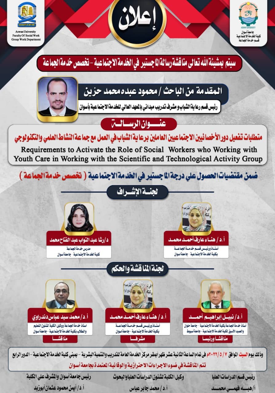 تقرر مناقشة “الدارس/ محمود عبده محمد حزين – الباحث بقسم خدمة الجماعة”، وذلك في يوم السبت الموافق ٢٠٢٢/٥/٧ م  في تمام الثانية عشر ظهراً بقاعة التنمية البشرية بمبنى كلية الخدمة الاجتماعية – الدور الرابع.