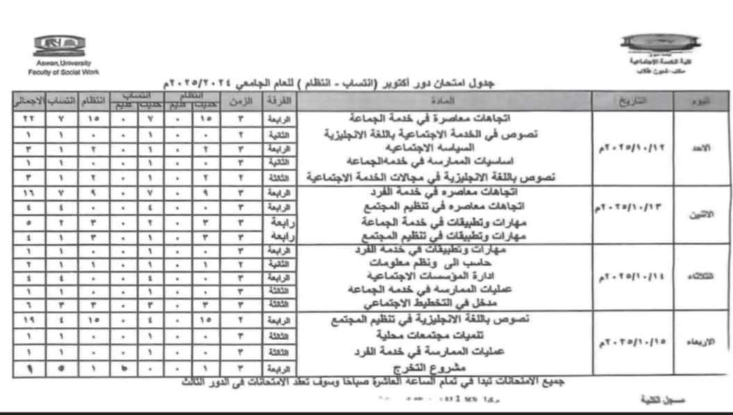 برعاية كريمة من الأستاذ الدكتور/ لؤي سعدالدين نصرت- القائم بعمل رئيس الجامعة والمشرف على الكلية، والأستاذ الدكتور/ محمد سيد عباس- وكيل الكلية لشئون التعليم والطلاب، فقد تم اعتماد جدول امتحانات دور أكتوبر (انتساب – انتظام) للعام الجامعي ٢٠٢٥/٢٠٢٤م، وذلك على النحو التالي: