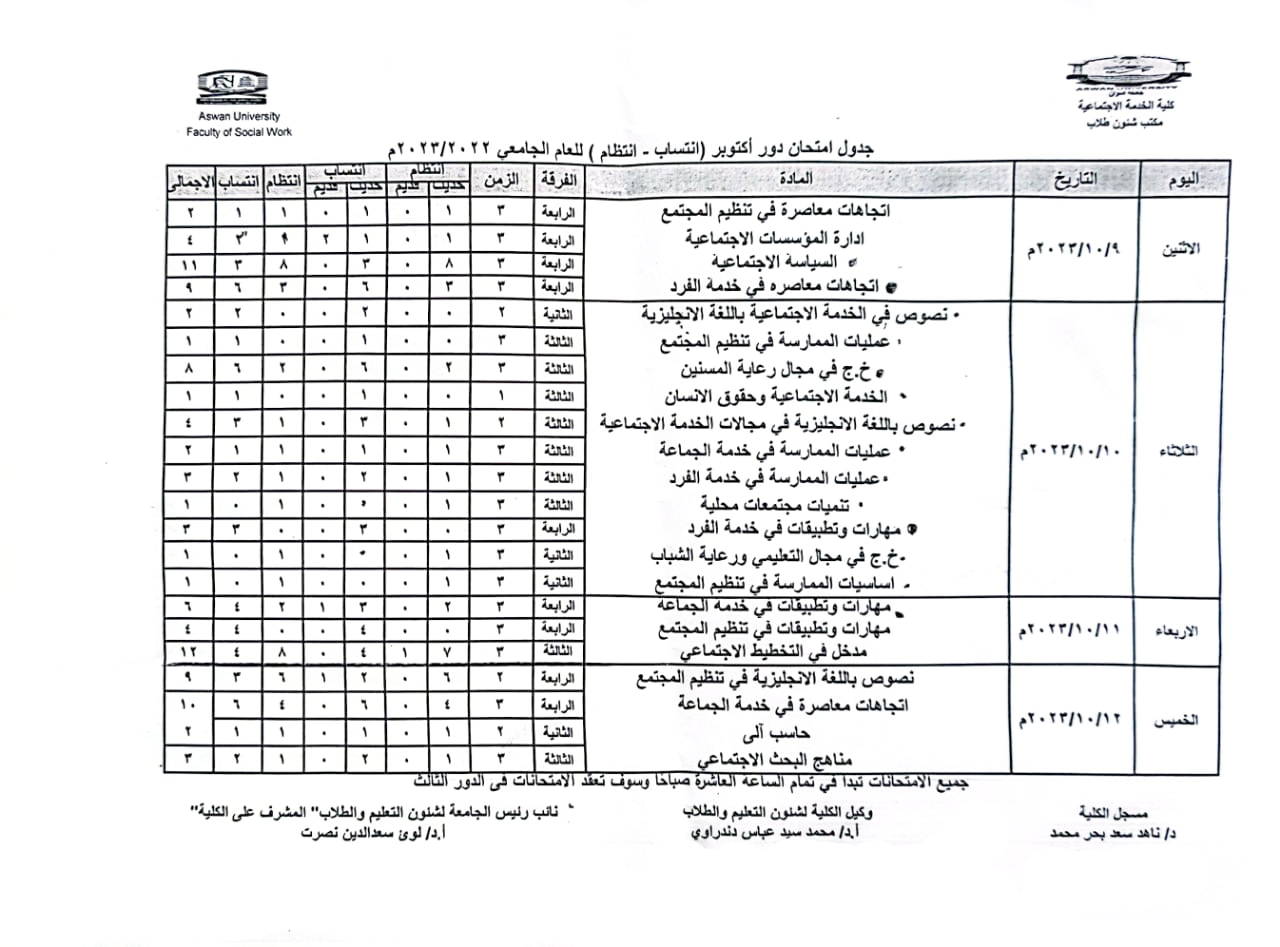 تحت رعاية الأستاذ الدكتور/ لؤي سعد الدين نصرت- نائب رئيس الجامعة والمشرف على الكلية، والأستاذ الدكتور/ محمد سيد عباس- وكيل الكلية لشئون التعليم والطلاب، تم اعتماد جداول امتحانات دور أكتوبر للعام الجامعي ٢٠٢٣/٢٠٢٢، وذلك من خلال الرابط التالي: