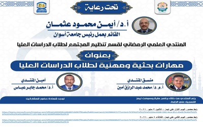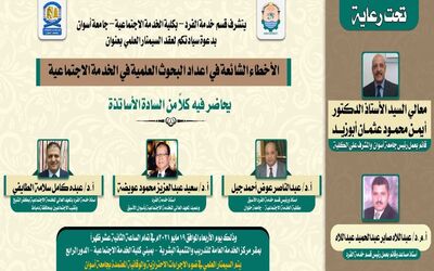 يتشرف قسم خدمة الفرد – بكلية الخدمة الاجتماعية – جامعة اسوان بدعوة سيادتكم لعقد السيمنار العلمي بعنوان ” الاخطاء الشائعة في اعداد البحوث العلمية في الخدمة الاجتماعية “ تحت رعاية – معالي السيد الأستاذ الدكتور – أيمن محمود عثمان أبو زيد – قائم بعمل رئيس جامعة اسوان والمشرف علي الكلية يحاضر فيه كلاًمن من السادة […]