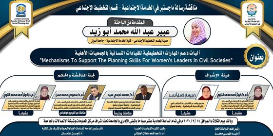 عقد اليوم الأربعاء الموافق 8/7/2020 السيمنار العلمي للباحثة / أمانى عبدالناصر عبدالواحد – للتسجيل لدرجة الماجستير بقسم التخطيط الاجتماعي