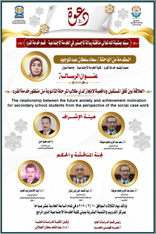 دعوة عامة لمناقشة رسالة الماجستير للباحثة / سعاد سلطان عبدالموجود – تحت عنوان ”العلاقة بين قلق المستقبل ودافعية الانجاز لدى طلاب المرحلة الثانوية من منظور خدمة الفرد “وذلك يوم الثلاثاء الموافق 2020/3/10 في تمام الساعة الحادية عشرصباحاً بقاعة التنمية البشرية بكلية الخدمة الاجتماعية الدور الرابع
