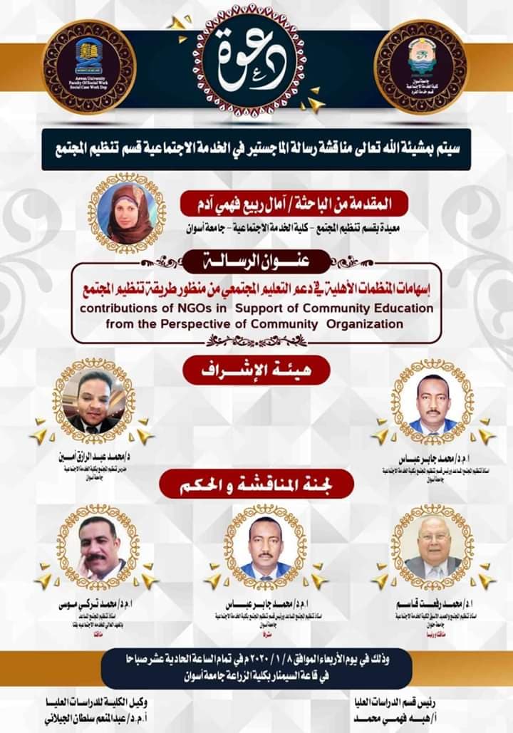 دعوة عامة لمناقشة رسالة الماجستير للباحثة /أمال ربيع فهمى – تحت عنوان ”اسهامات المنظمات الاهلية فى دعم التعليم المجتمعى من منظور طريقة تنظيم المجتمع “ وذلك يوم الاربعاء الموافق 2020/1/8 في تمام الساعة الحادية عشر صباحاً بقاعة السيمنار بكلية الزراعة .