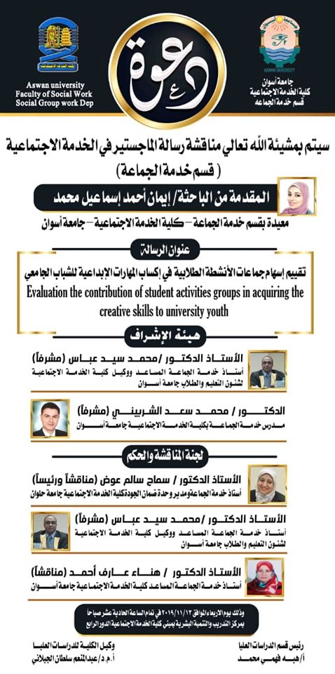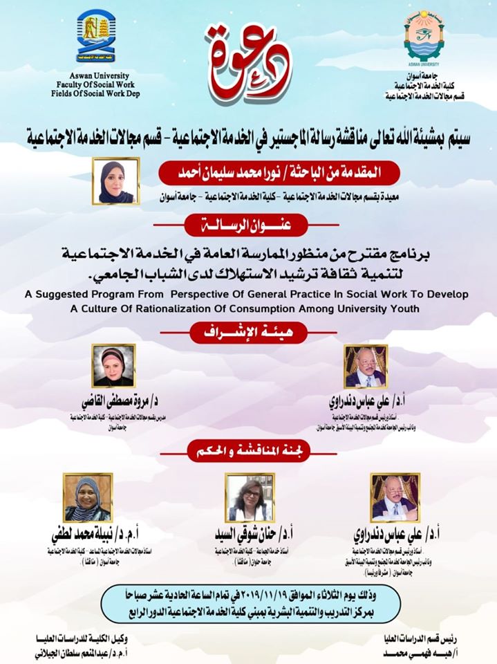 عقد اليوم الاربعاء الموافق 20/11/2019 م السيمنار العلمي للباحث /احمد عبد النعيم _ بقسم تنظيم المجتمع وذلك بحضور كلا من : أ.د/ علي عباس دندراوى _ رئيس قسم مجالات الخدمة الاجتماعية و نائب رئيس الجامعة السابق – – وأ.م.د عبد المنعم سلطان الجيلاني _ وكيل الكلية لشئون الدراسات العليا و البحوث وأ.م.د/ محمد جابر […]