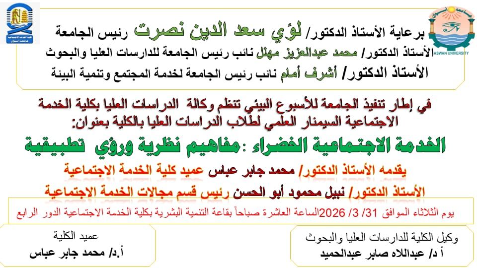 تحت رعاية معالي الأستاذ الدكتور/ لؤي سعدالدين نصرت – رئيس الجامعة الأستاذ الدكتور/أشرف امام ـ نائب رئيس الجامعة لشئون خدمة المجتمع وتنمية البيئة الأستاذ الدكتور/محمد جابر عباس محمد ـ عميد كلية الخدمة الاجتماعية في إطار تنفيذ الجامعة للأسبوع البيئي ينظم قسم خدمة الجماعة ندوة بعنوان: خدمة الجماعة الخضراء وبناء مستقبل مستدام. ويقدمها كلا من : […]