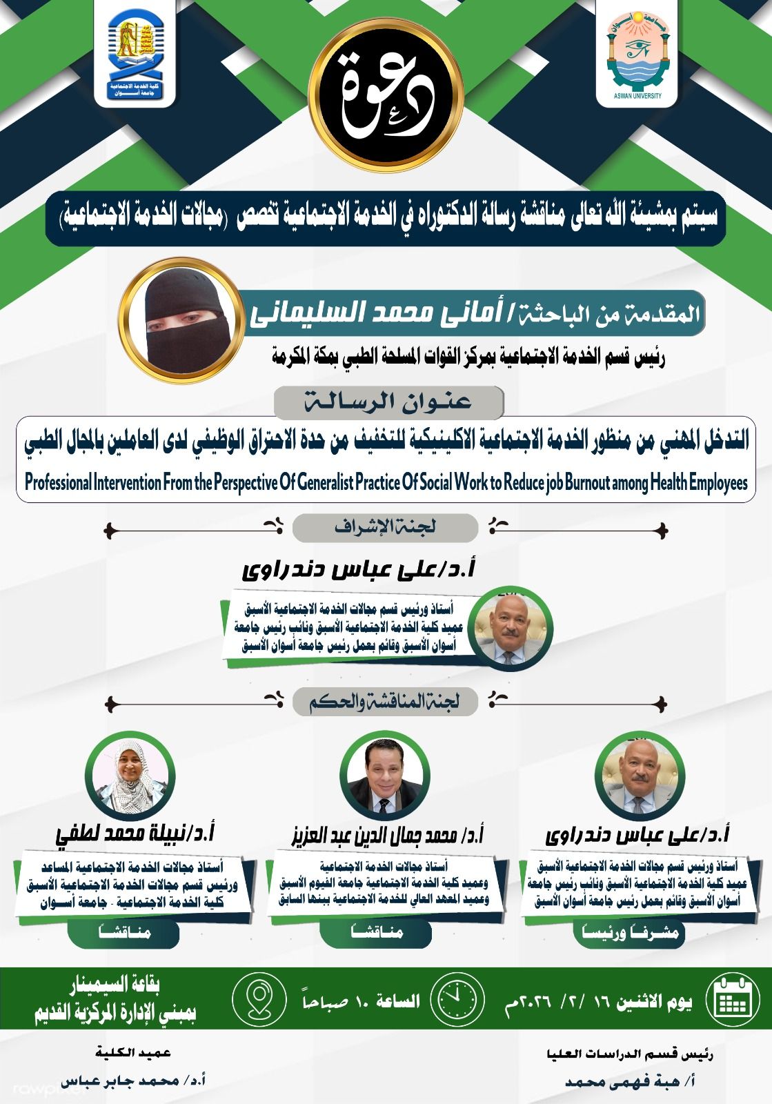 تحت رعاية معالي الاستاذ الدكتور / لؤي سعد الدين نصرت -رئيس الجامعة والسيد والاستاذ الدكتور/ محمد جابر عباس محمد- عميد الكلية. يتشرف قسم تنظيم المجتمع بدعوة حضراتكم لحضور مناقشة رسالة الماجستير للدارس / مصطفي كمال سليم. وذلك يوم الثلاثاء الموافق ١٧/ ٢/ ٢٠٢٦ بقاعة التنمية البشرية بالكلية في تمام الساعة العاشرة صباحا . حضوركم يشرفنا […]