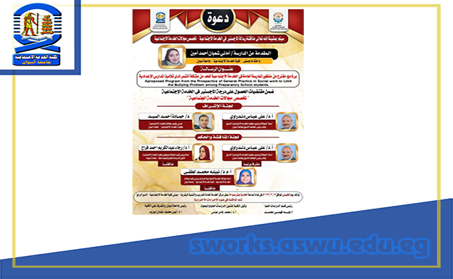 نوقشت اليوم الخميس ٢٠٢٢/٣/١٧ م الرسالة العلمية للدارسة “أماني شعبان أحمد أمين – الباحثة بقسم مجالات الخدمة الإجتماعية” وذلك ضمن متقتضيات الحصول على درجة الماجستير. والرسالة بعنوان “ برنامج مقترح من منظور الممارسة العامة في الخدمة الاجتماعية للحد من مشكلة التنمر لدى تلاميذ المدارس الاعدادية ” . وتكونت لجنة المناقشة والحُكم من : –أ.د/علي عباس […]