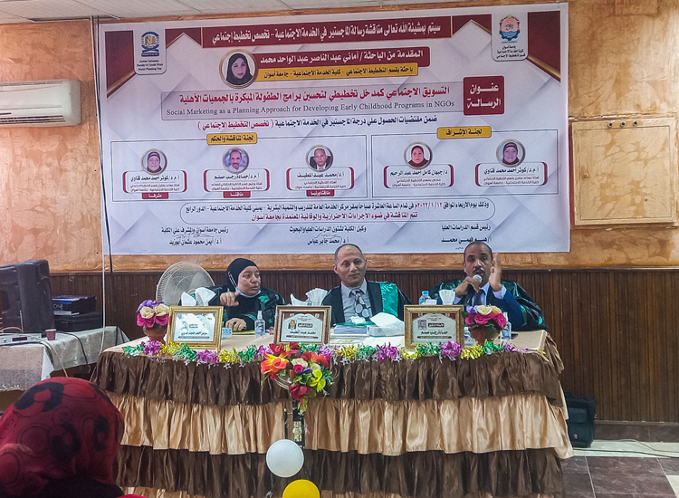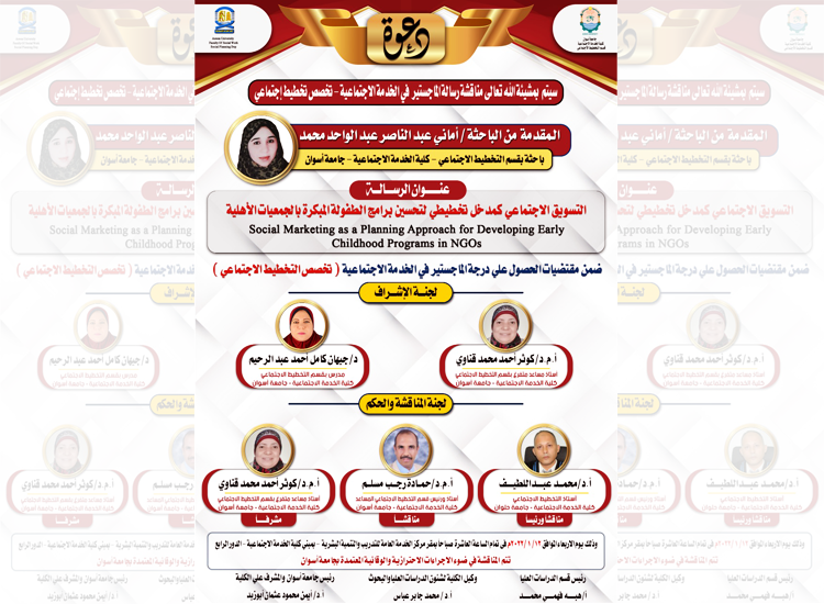 نوقشت اليوم الاربعاء ٢٠٢٢/١/١٢ م الرسالة العلمية للدارسة “أماني عبدالناصر عبدالواحد – الباحثة بقسم التخطيط الاجتماعي” وذلك ضمن متقتضيات الحصول على درجة الماجستير . والرسالة بعنوان “ التسويق الاجتماعي كمدخل تخطيطي لتحسين برامج الطفولة المبكرة بالجمعيات الأهلية” . وتكونت لجنة المناقشة والحُكم من : ١- أ.د/ محمد عبداللطيف – استاذ التخطيط الاجتماعي بكلية الخدمة الاجتماعية […]