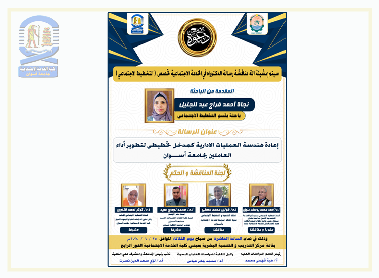 تقرر مناقشة الباحثة/ نجاة أحمد فرّاج عبدالجليل- بقسم التخطيط الاجتماعي مرحلة الدكتوره في يوم الثلاثاء الموافق ٢٠٢٤/٦/٢٥م في تمام العاشرة صباحاً بقاعة مركز التدريب والتنمية البشرية بمبنى الكلية الدور الرابع، وذلك ضمن متقتضيات الحصول على درجة الدكتوراه في الخدمة الاجتماعية.