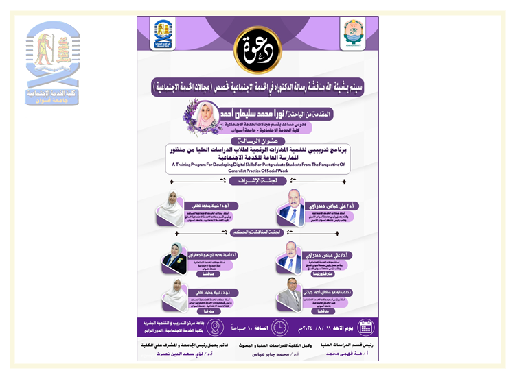 تقرر مناقشة الباحثة/ نورا محمد سليمان أحمد- المدرس المساعد بقسم مجالات الخدمة الاجتماعية مرحلة الدكتوراه في يوم الأحد الموافق ٢٠٢٤/٨/١١م في تمام العاشرة صباحاً بقاعة مركز التدريب والتنمية البشرية بمبنى الكلية الدور الرابع، وذلك ضمن متقتضيات الحصول على درجة الدكتوراه في الخدمة الاجتماعية.