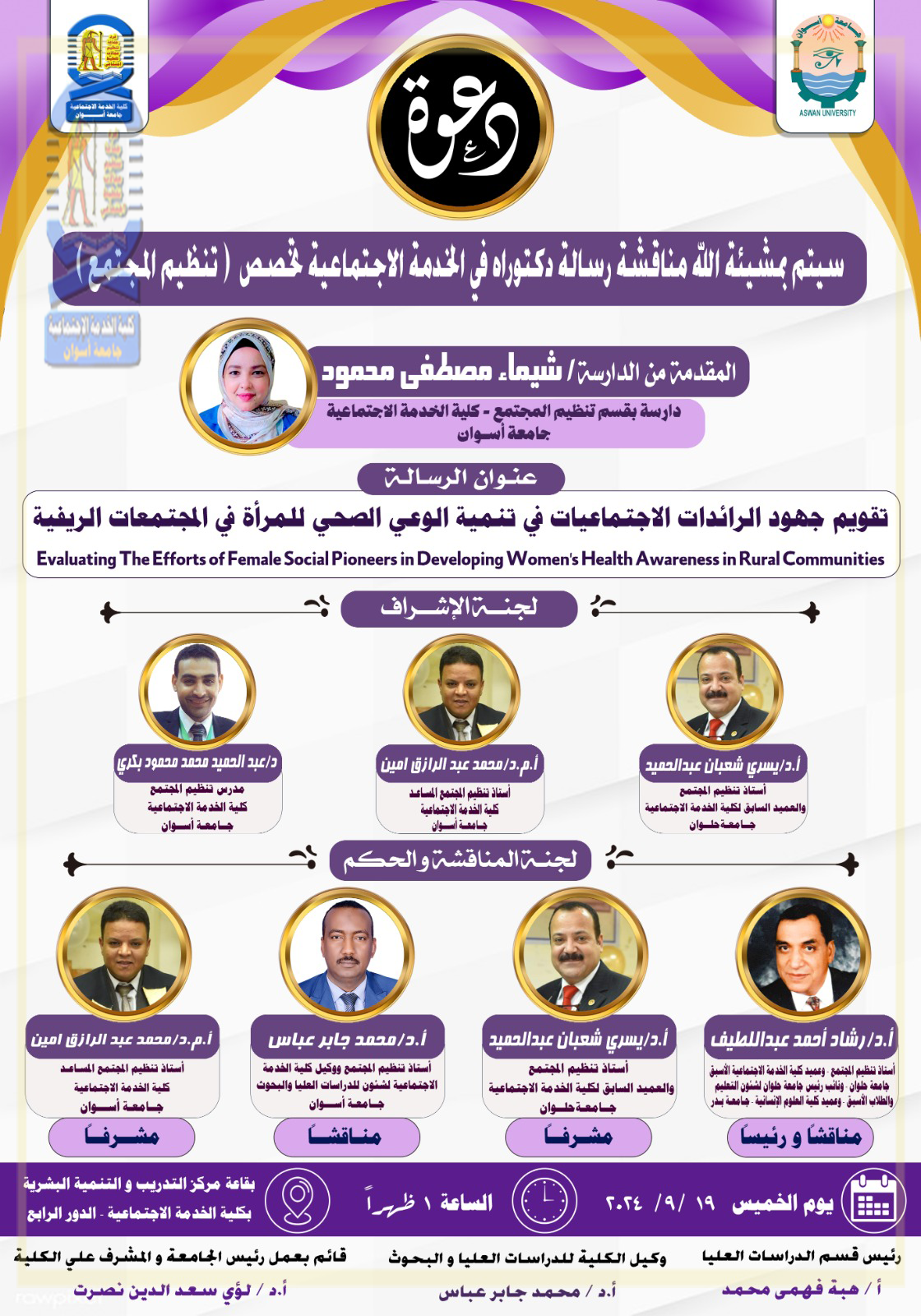 تقرر مناقشة الباحثة/ شيماء مصطفى محمود- بقسم تنظيم المجتمع مرحلة الدكتوراه في يوم الخميس الموافق ٢٠٢٤/٩/١٩م في تمام الواحدة ظهراً بقاعة مركز التدريب والتنمية البشرية بمبنى الكلية الدور الرابع، وذلك ضمن متقتضيات الحصول على درجة الدكتوراه في الخدمة الاجتماعية.